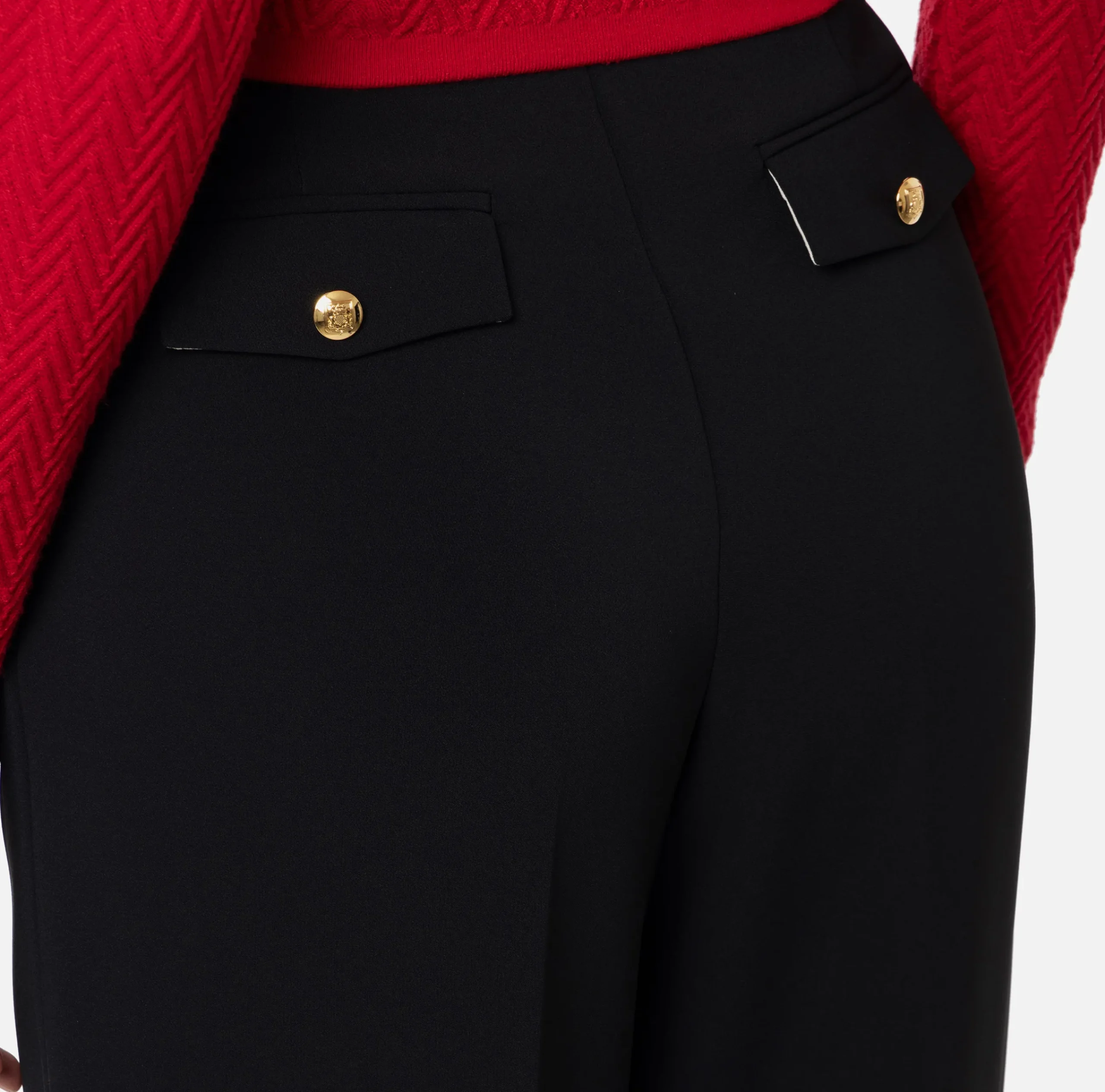 Pantalone dritto in crêpe stretch con doppie pinces sul davanti e tasche a patta sul retro con bottoni in metallo dorato.