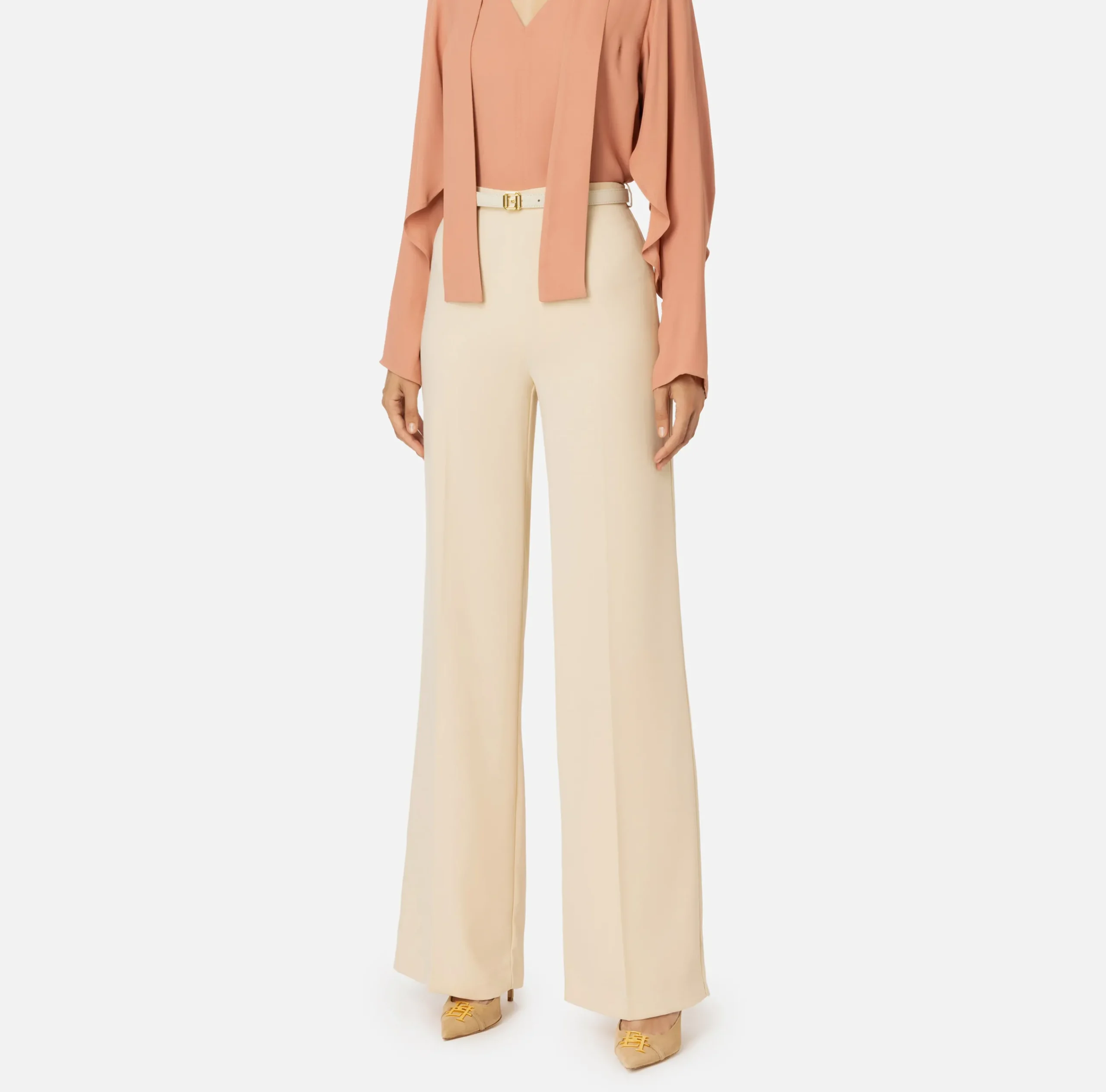 Pantalone palazzo in raso con stiro piega. Il punto vita è enfatizzato da una cintura con fibbia logo in metallo dorato e chiusura a pomelli.