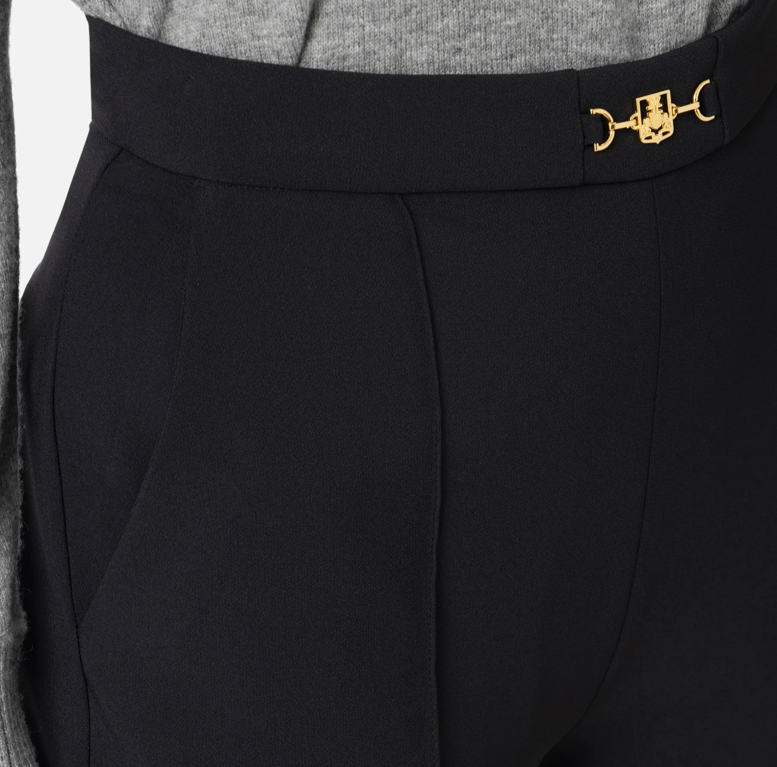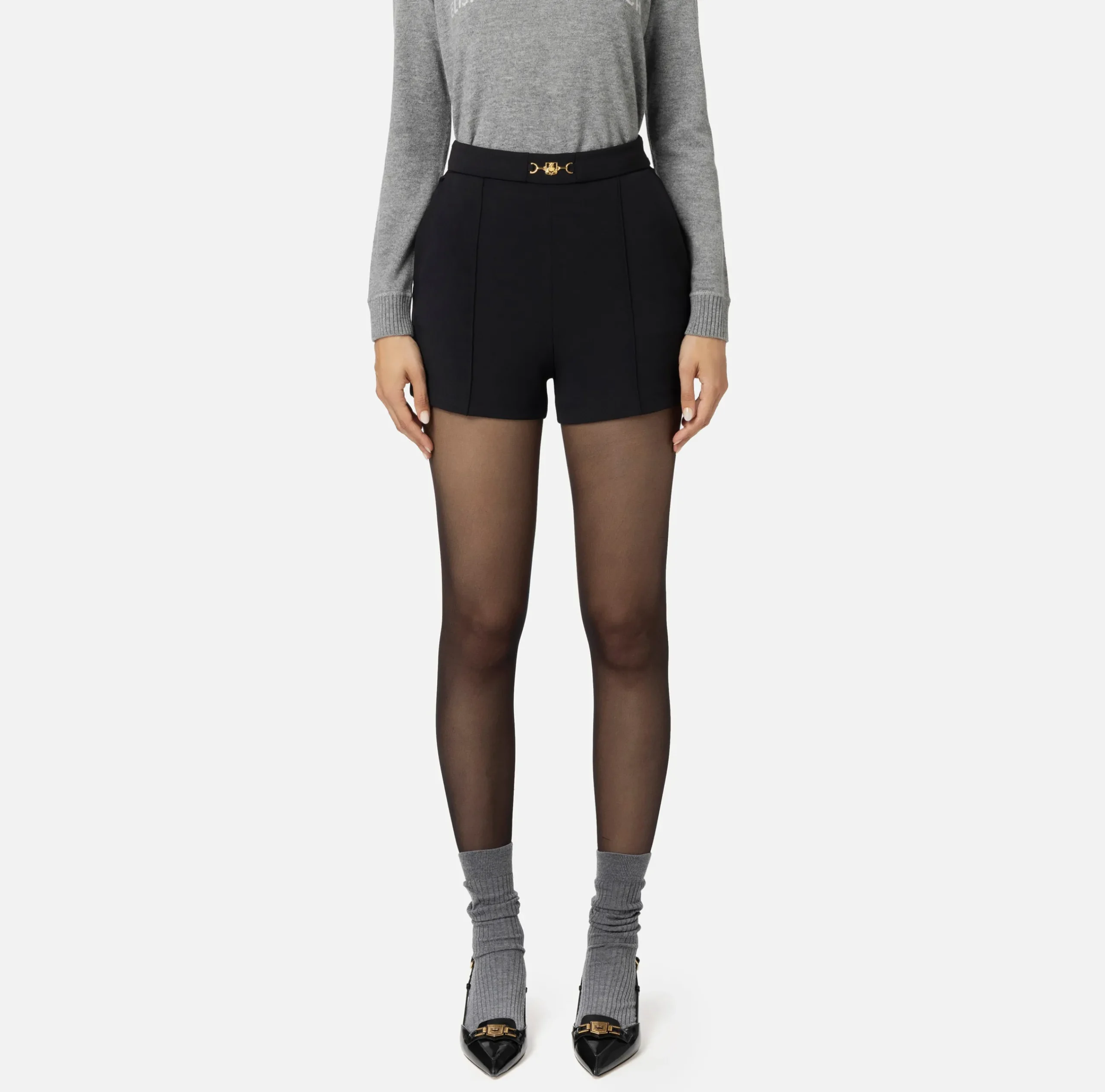 Short con vita alta in doppio crêpe stretch. È caratterizzato da fascione con morsetto logo in metallo dorato.