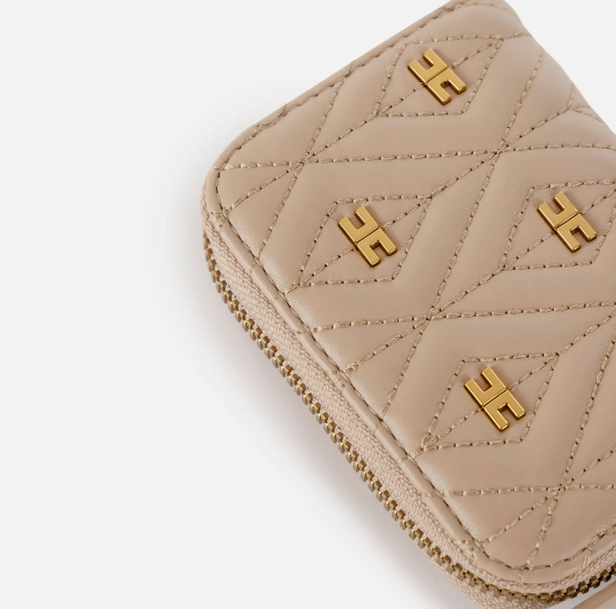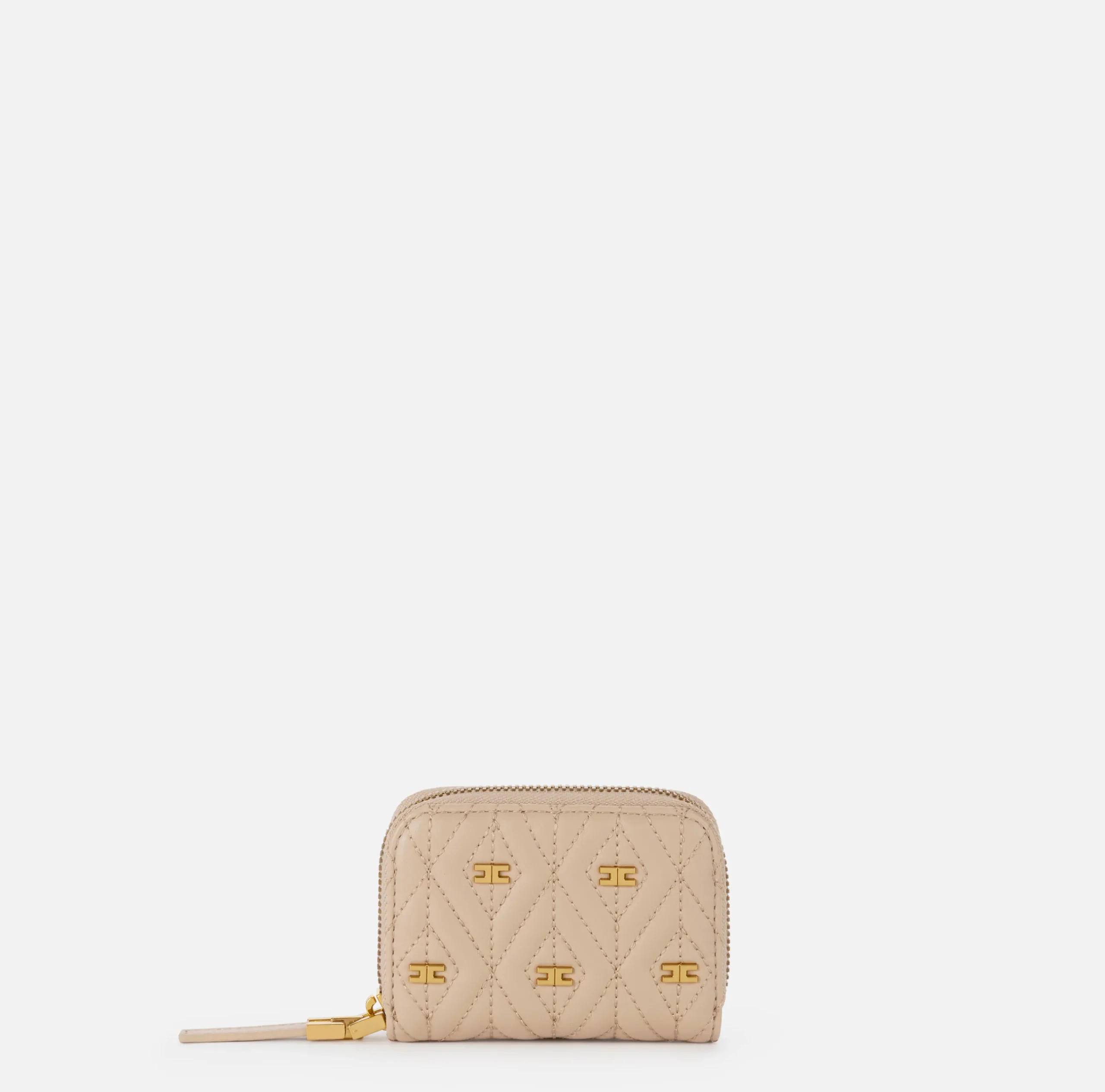 Portafoglio in materiale sintetico effetto pelle. Superficie trapuntata e imbottita con rivetti logati in metallo dorato vintage. È caratterizzato da tirazip logato.