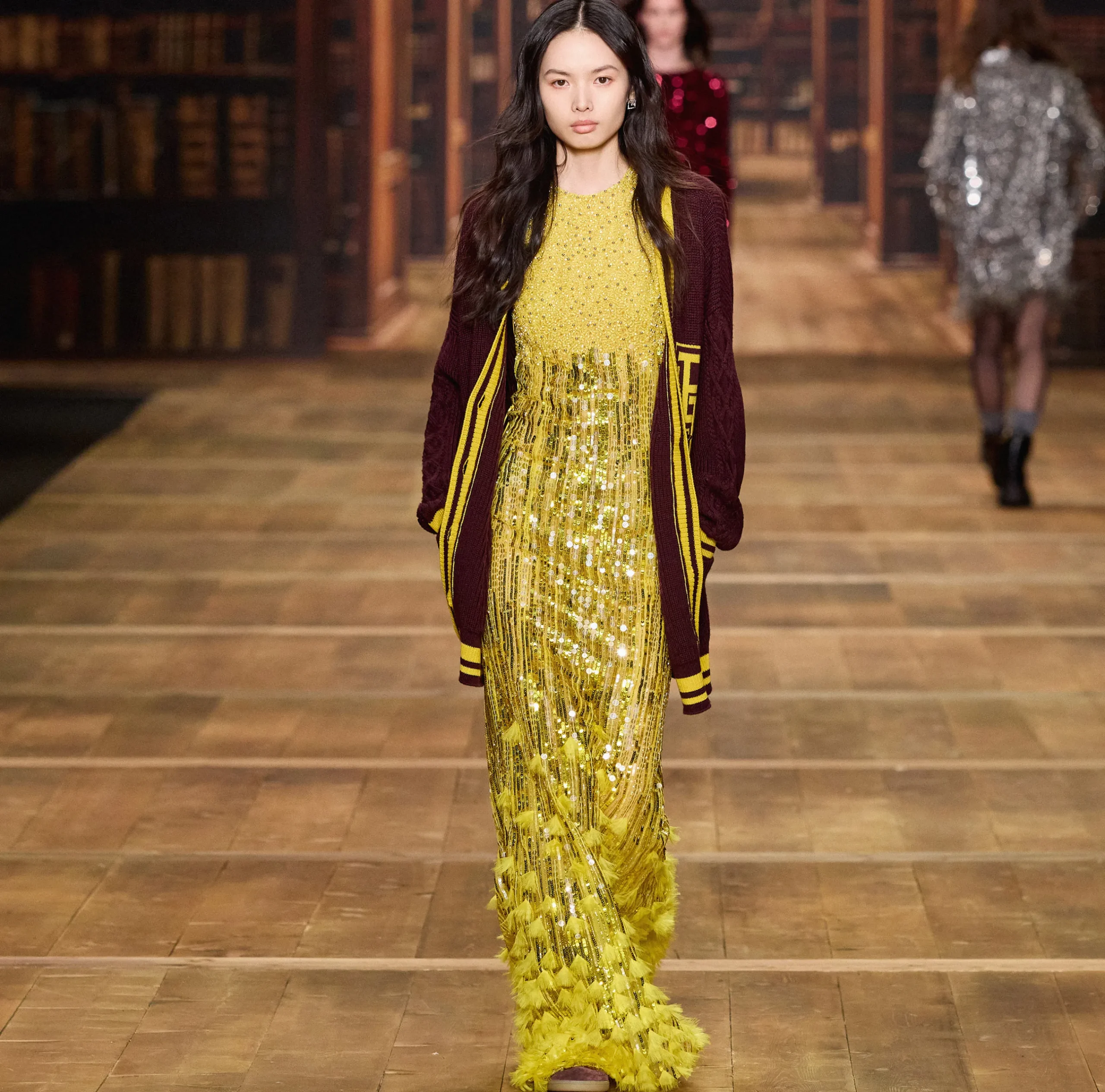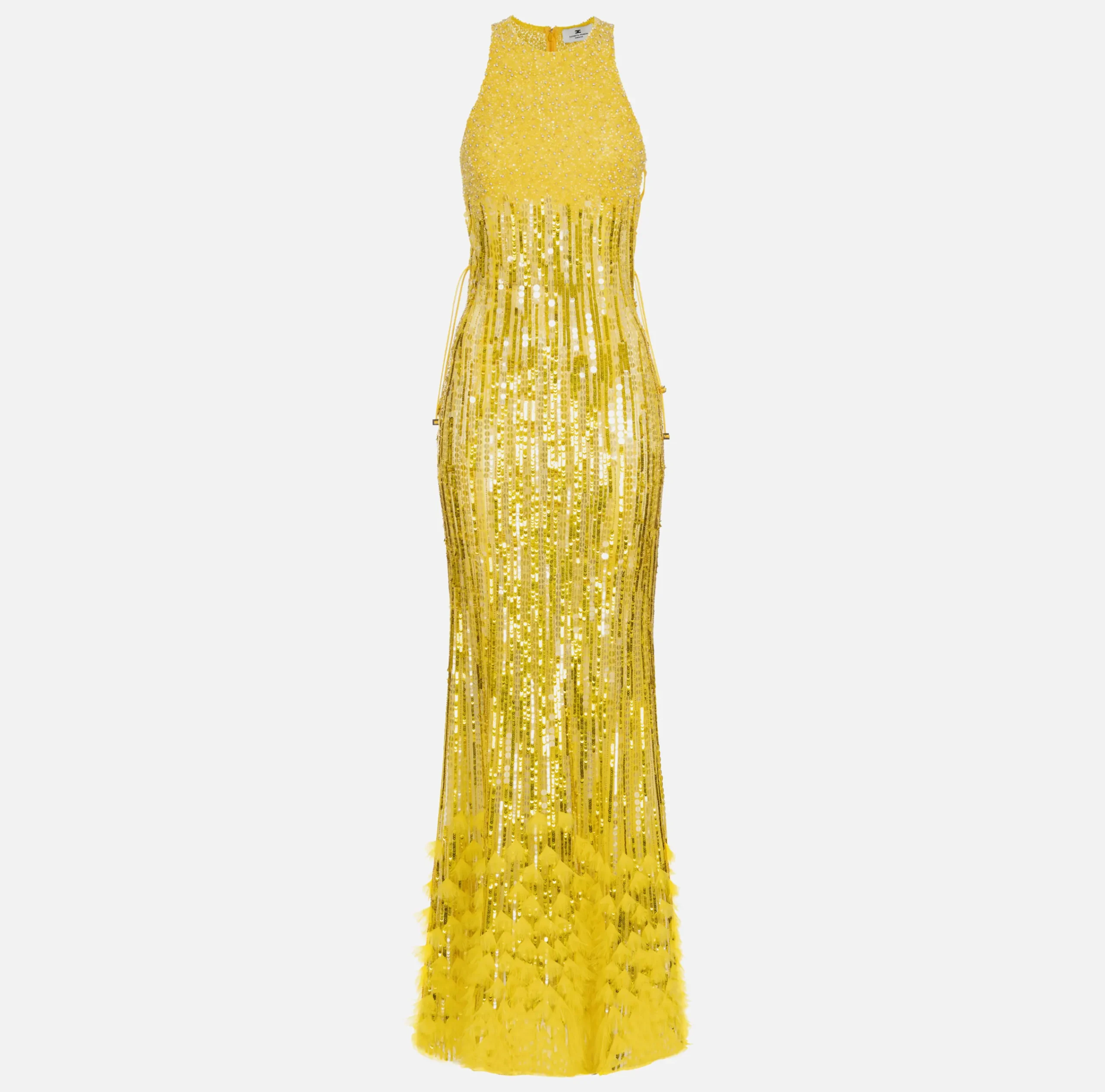 Abito red carpet ricamato a mano con perline, paillettes e canottiglie che donano movimento e tridimensionalità. È caratterizzato da scollo all’americana, lacci criss-cross sui fianchi e gonna a sirena con frange di organza al fondo.