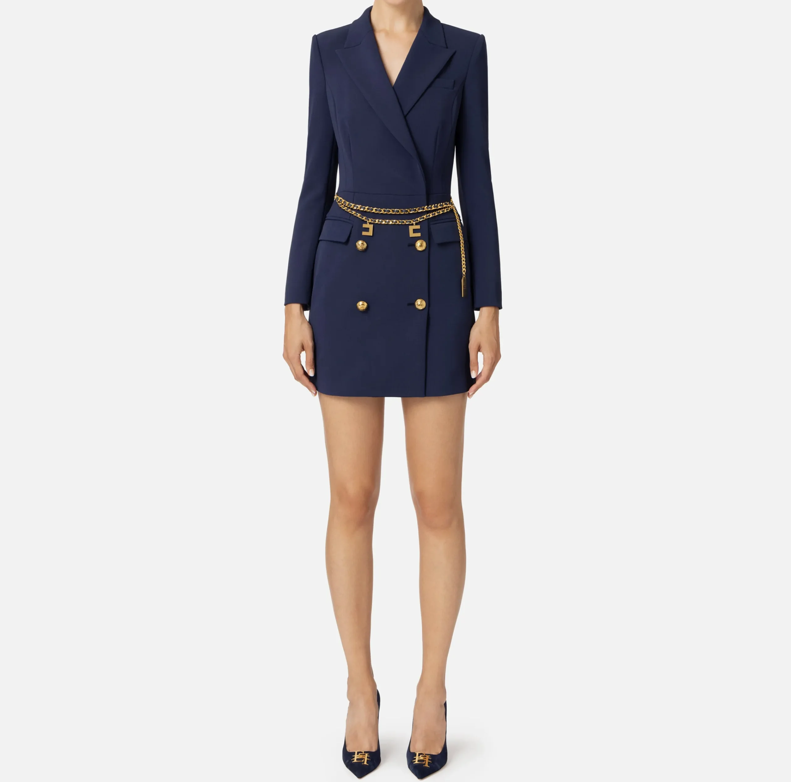 Robe manteau doppiopetto in doppio crêpe stretch con revers a lancia e maniche lunghe. Il punto vita è enfatizzato da una cintura in catena infilata e charms logo in metallo dorato.