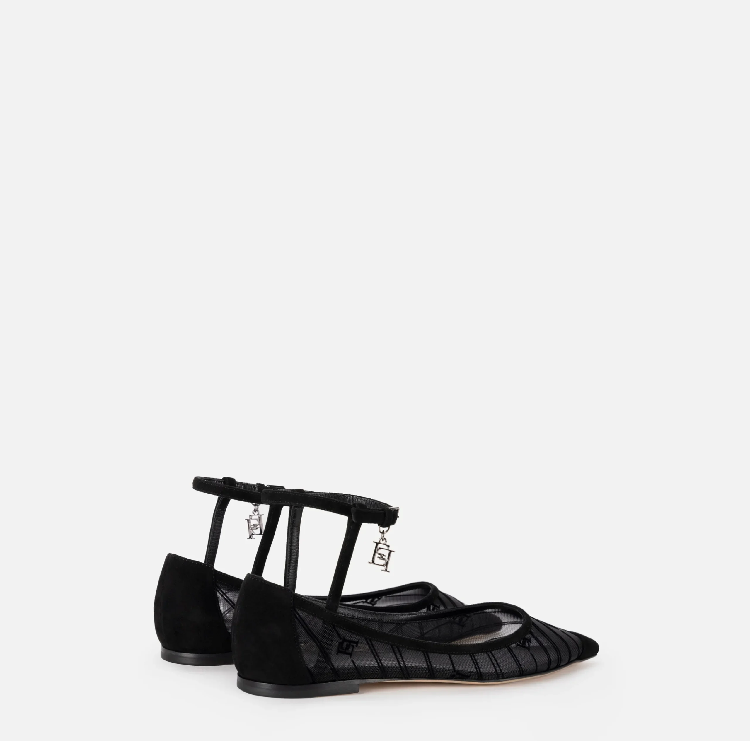 Ballerine in rete flock con puntalino in gros grain. È caratterizzata da cinturino alla caviglia regolabile da fibbia con charms logo in metallo dorato.