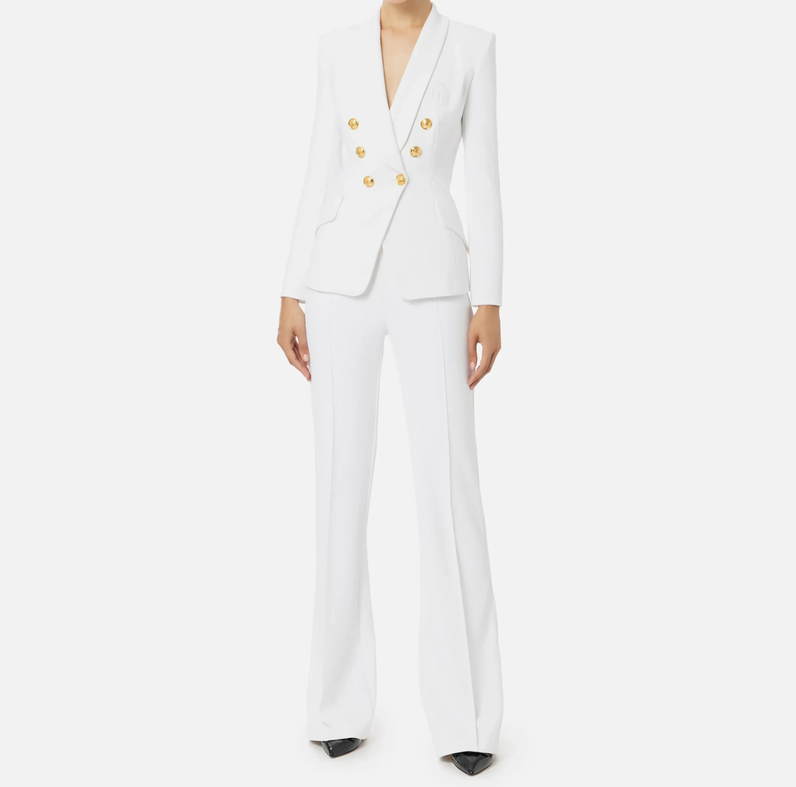 Tailleur in doppio crêpe stretch composto da giacca doppiopetto con tasche a filetto e patta impreziosita da ricamo a stemma logo sul petto e pantalone palazzo.