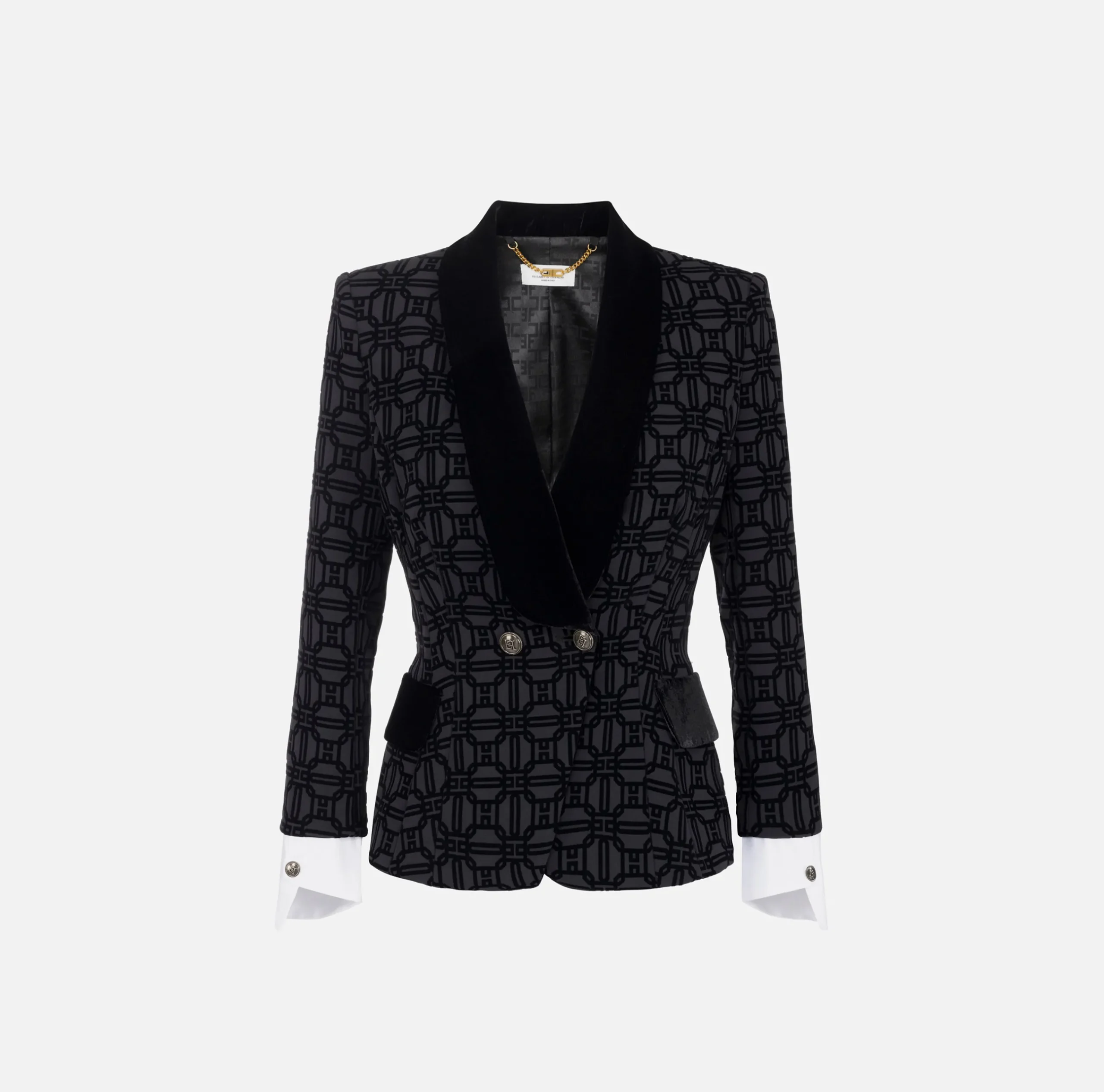 Giacca doppiopetto in crêpe stampa flock all-over a maniche a ¾ con polsi in popeline. È caratterizzata da revers sciallato e tasche frontali con pattina in velluto.