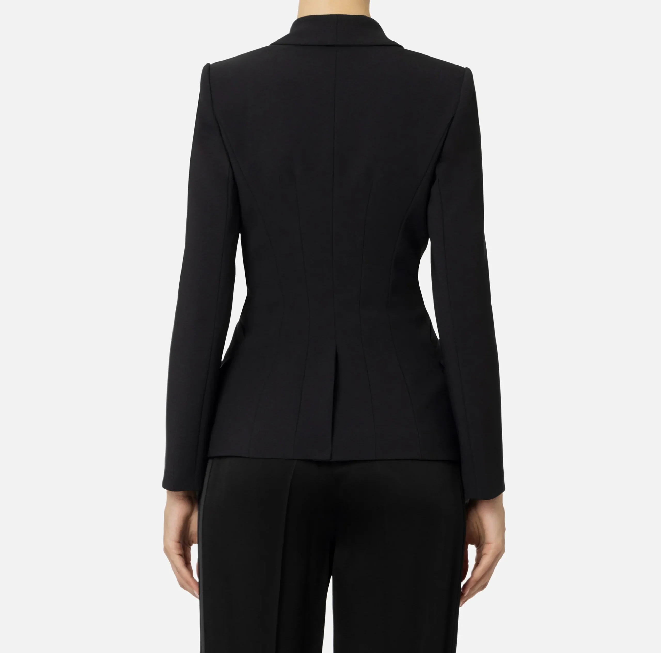 Giacca doppiopetto in crêpe stretch con tasche frontali a filetto e con pattina. È caratterizzata da revers sciallato e ricamo logo ad altezza seno in tono.