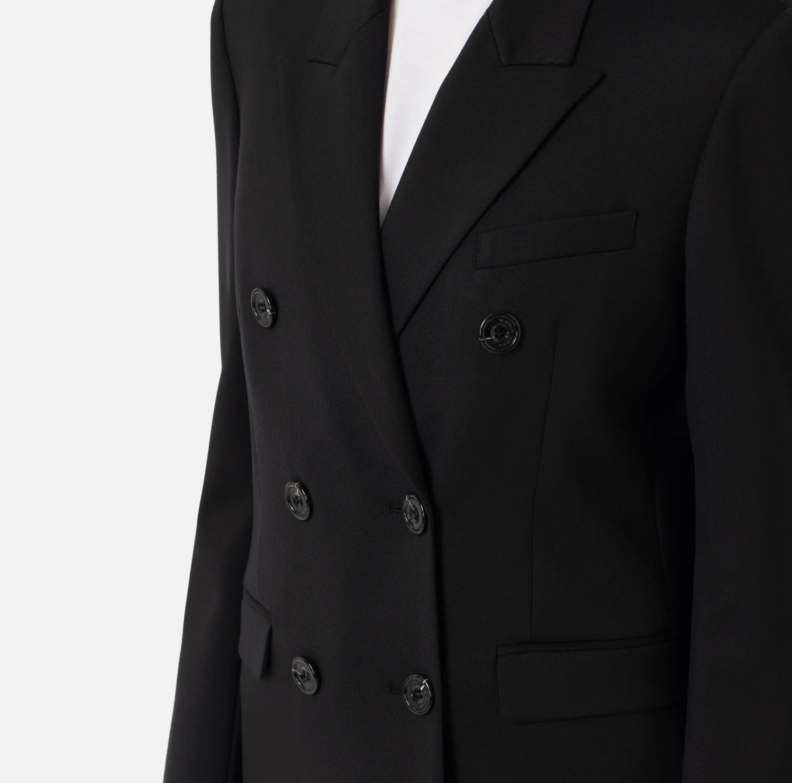 Giacca doppiopetto in fresco lana con tasche frontali con pattina e tasca a filetto. È caratterizzata da revers a lancia e bottoni logati effetto corno.