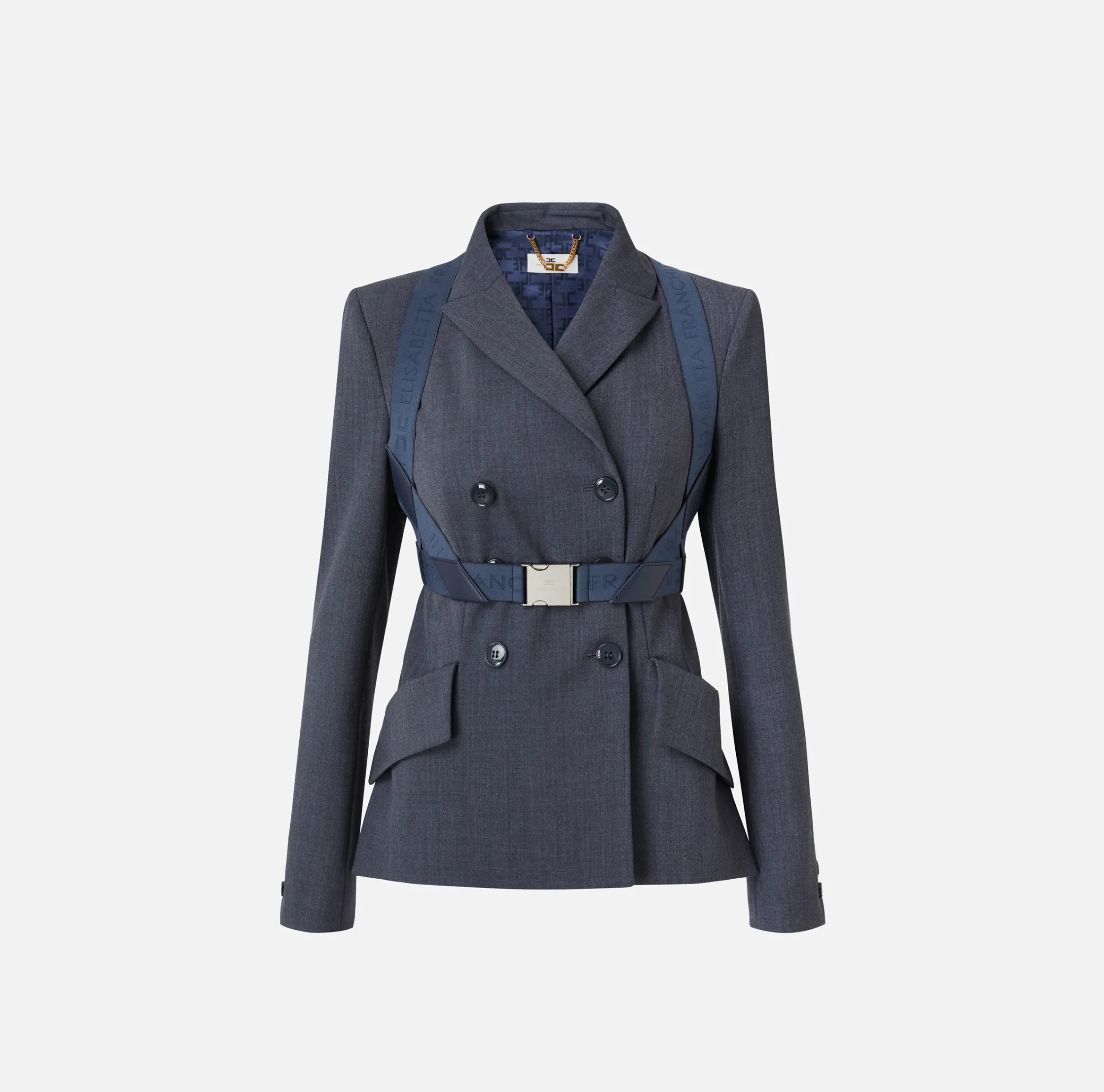 Giacca doppiopetto in fresco lana mélange con tasche frontali con pattina. È caratterizzata da accessorio harness in elastico logato con fibbia in metallo silver.