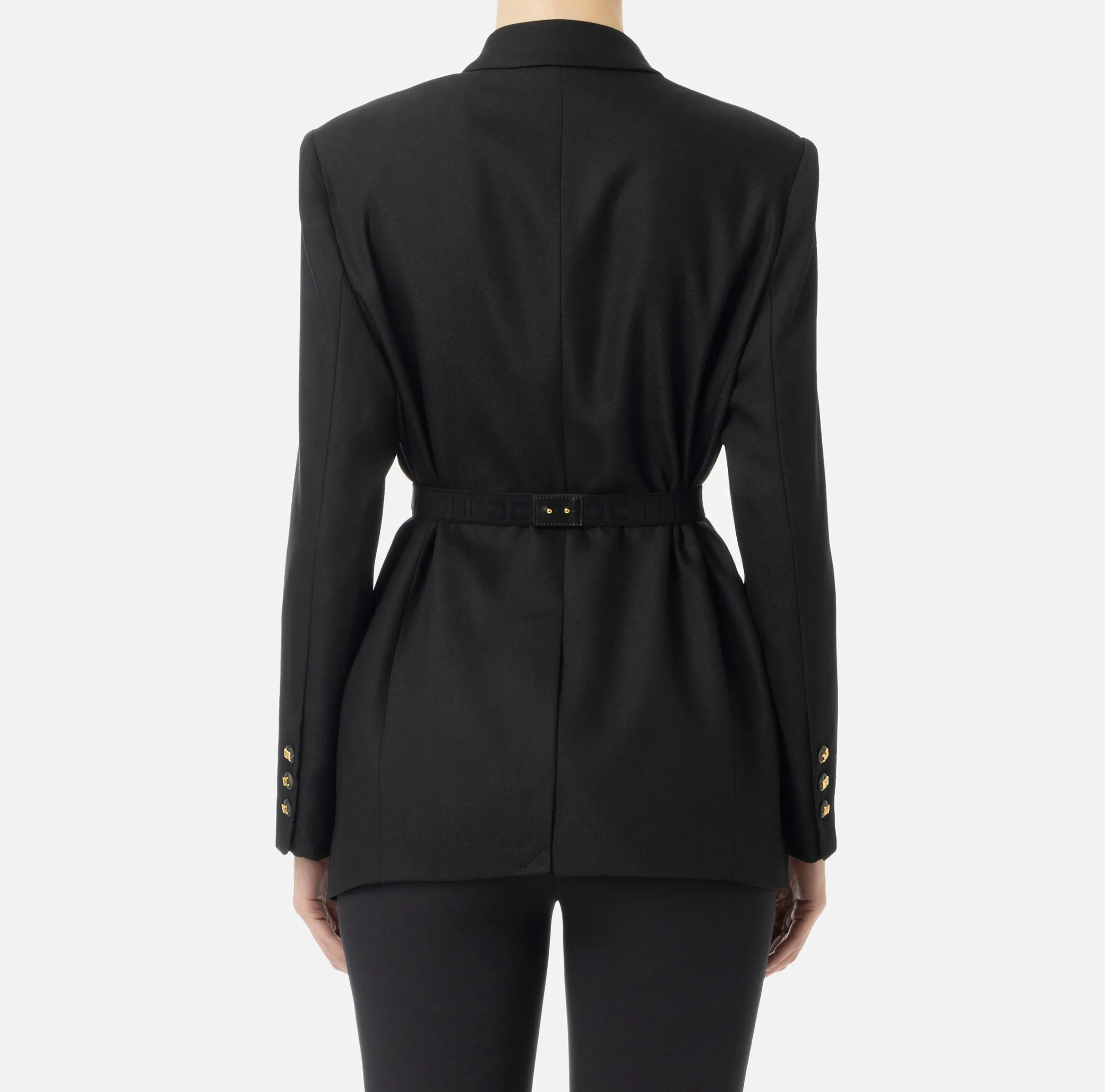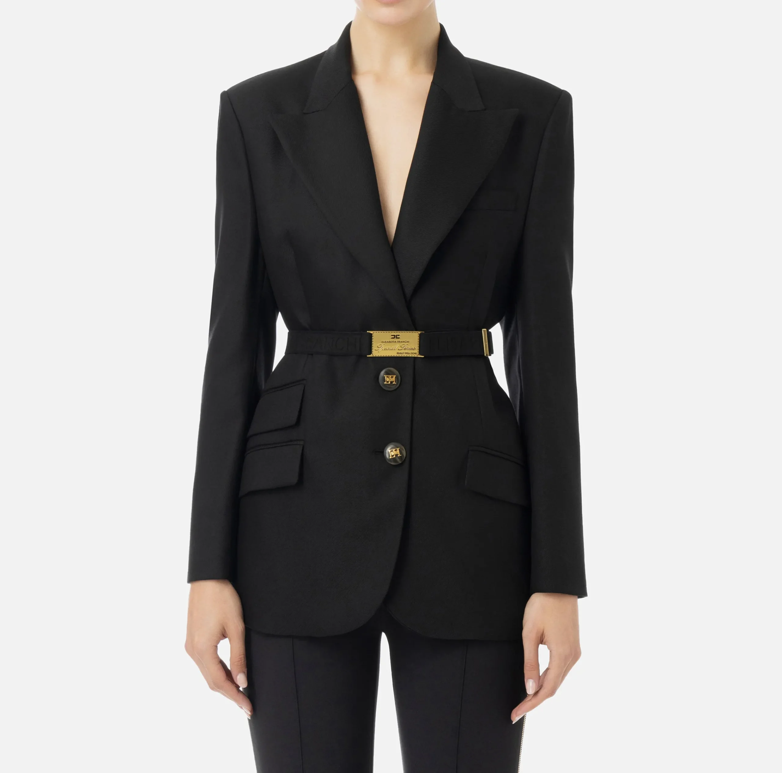 Giacca in fresco di lana stretch con spalle strutturate, chiusura monopetto e tasche frontali con pattina. Il punto vita è enfatizzato da una cintura in elastico logato con fibbia in metallo dorato.