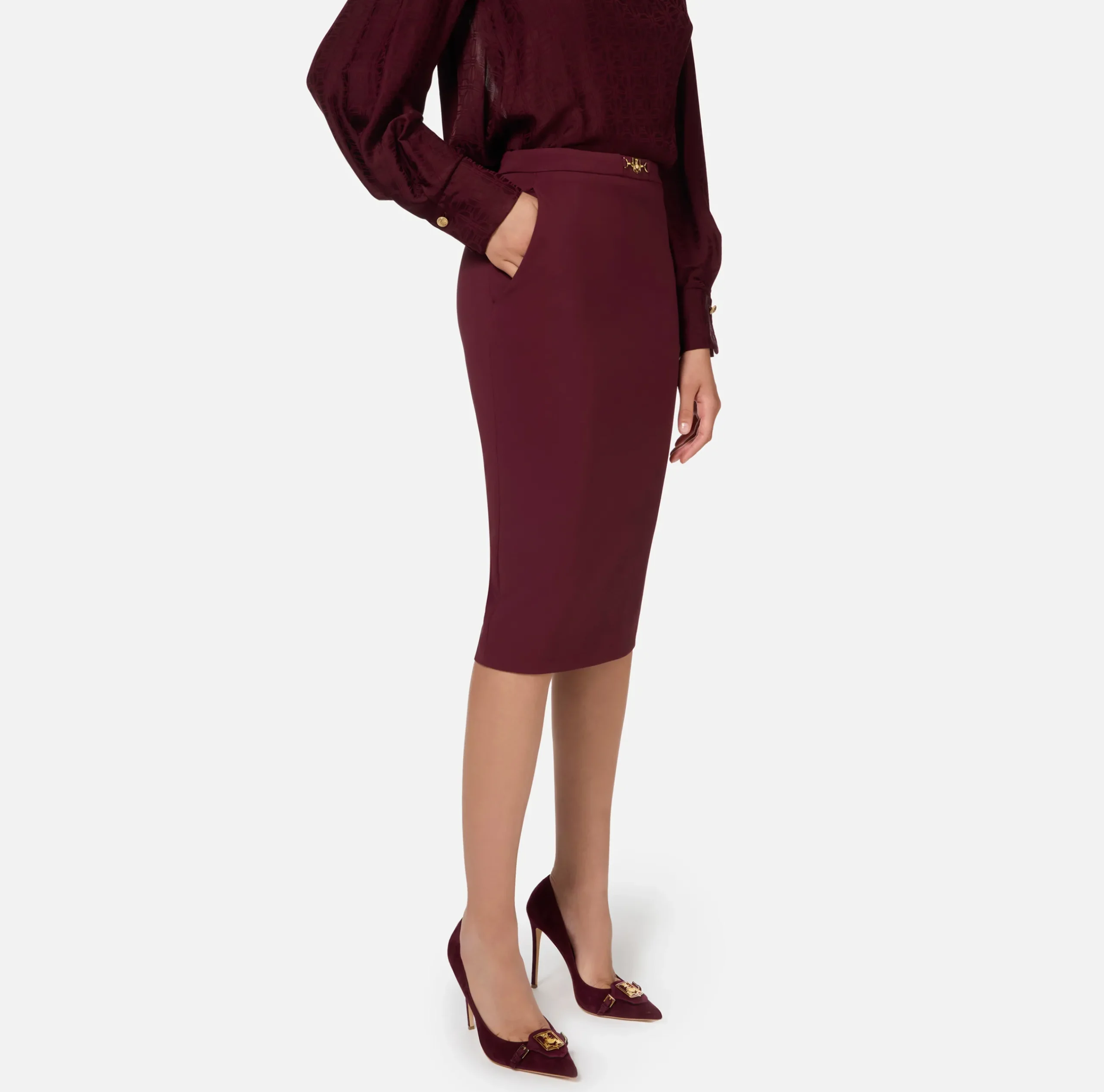 Gonna midi in crêpe stretch con tasche alla francese e spacco sul retro. È caratterizzata da fascione con morsetto in metallo dorato.