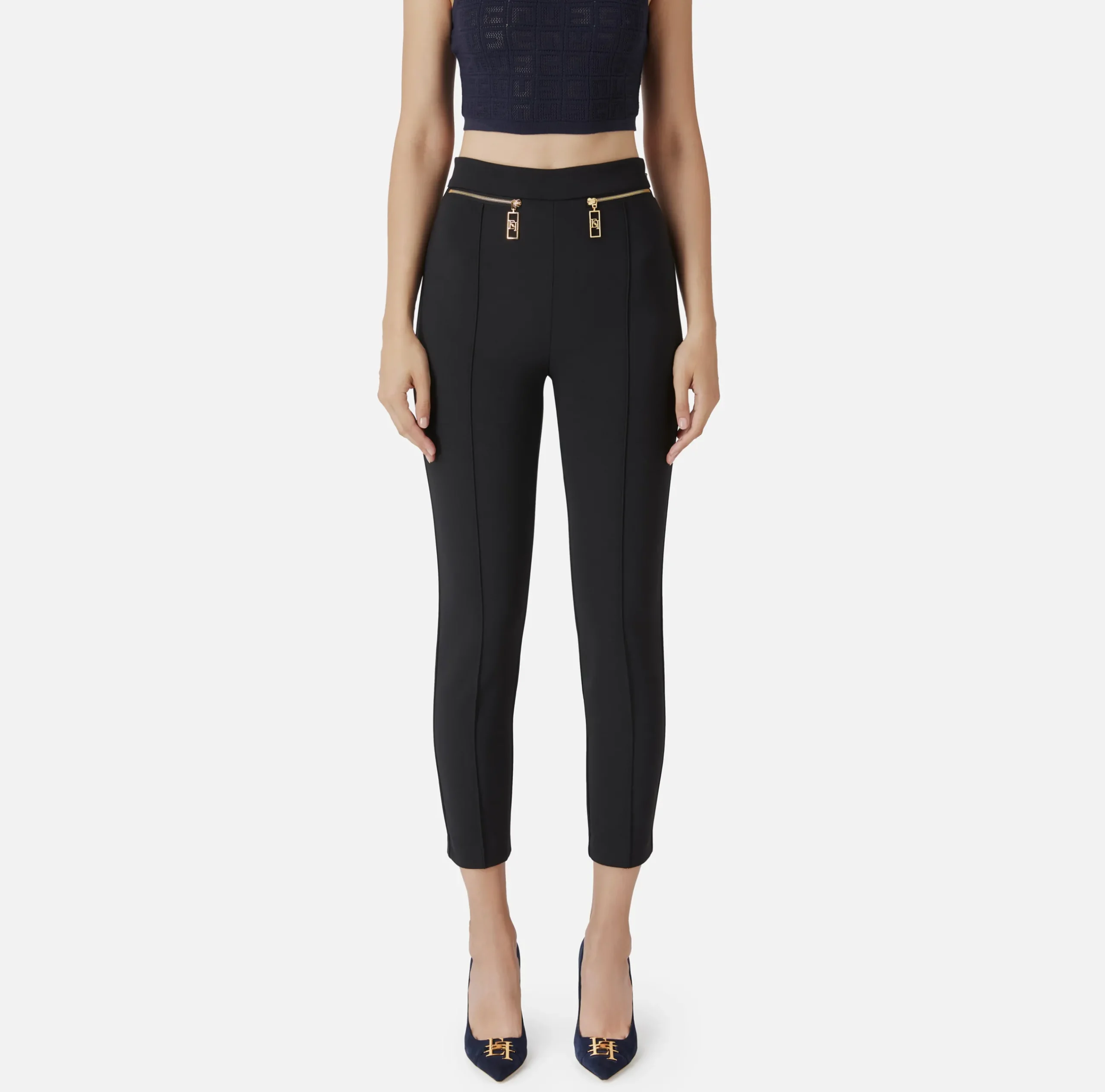 Pantalone dritto alla caviglia in doppio crêpe stretch. È caratterizzato da motivo di doppia zip con tiretto logato inserite sotto il fascione.