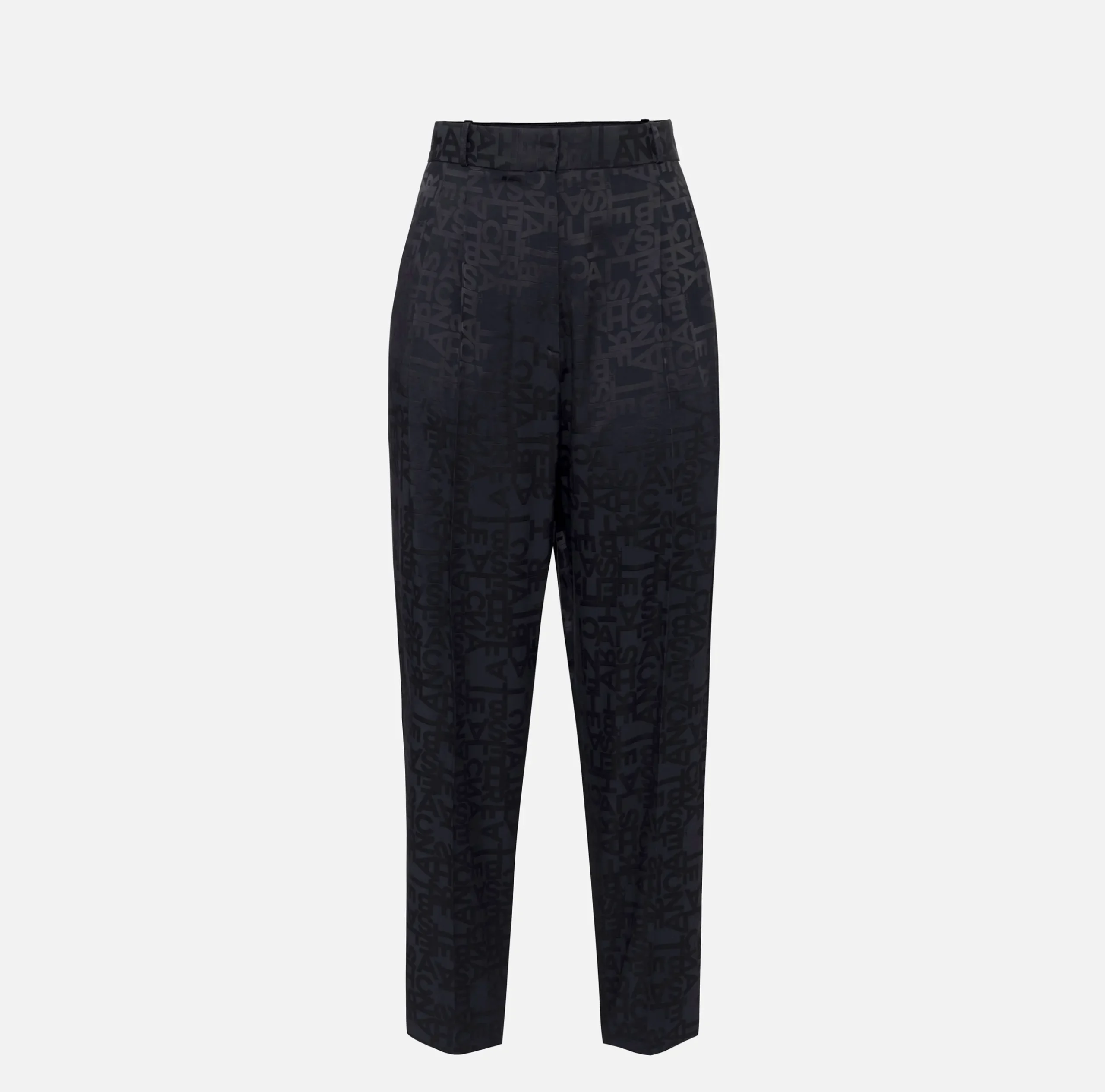 Pantalone dritto in crêpe jacquard lettering con tasche alla francese davanti e a patta sul dietro. È caratterizzato da fascione in vita e doppia pinces sul davanti che donano ampiezza al bacino e gamba che si chiude leggermente al fondo.