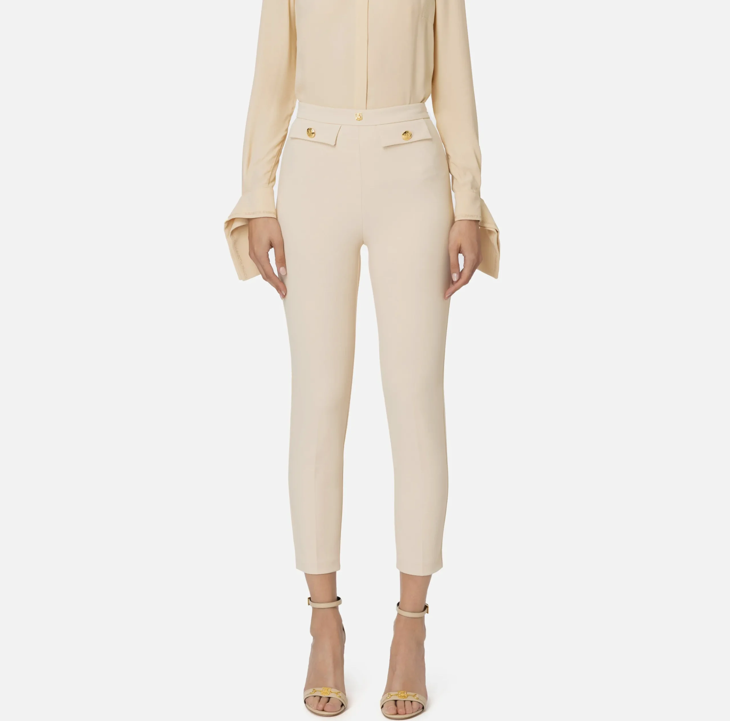 Tailleur|Pantaloni E Shorts|Elisabetta Franchi Pantalone dritto in crêpe stretch con rivetto logo Crema