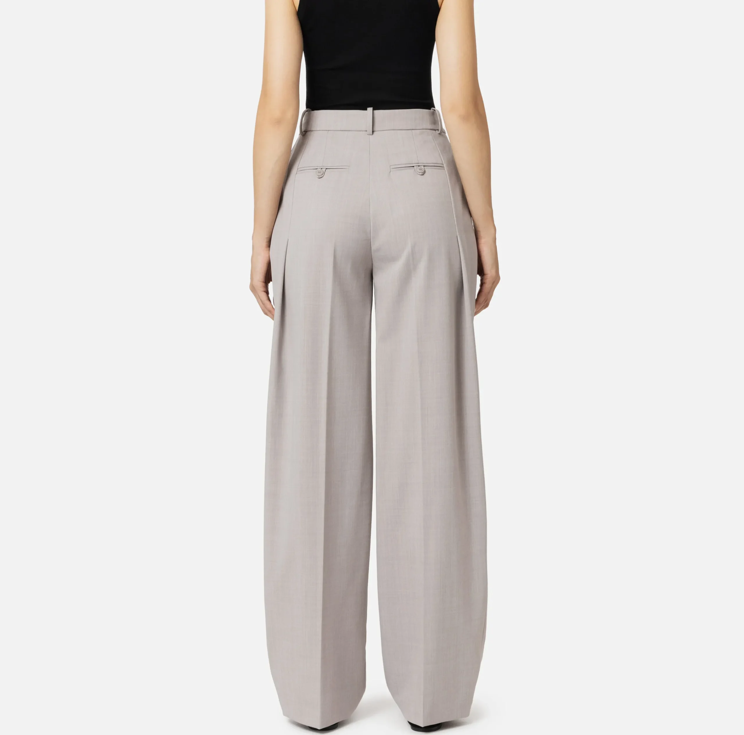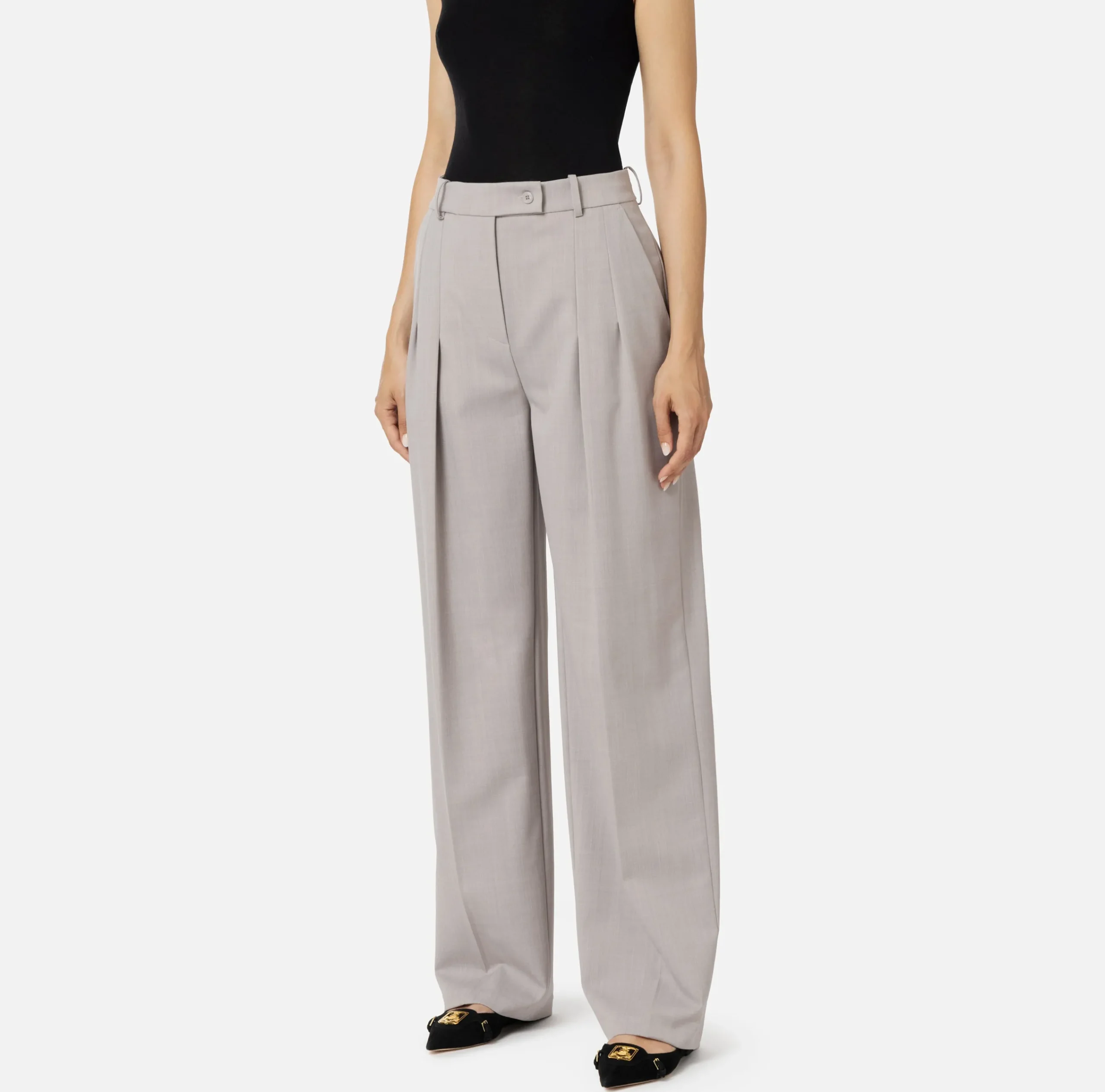 Pantalone dritto in fresco lana mélange a vita alta con doppie pinces, tasche alla francese sul davanti e tasche a filetto rifinite da bottoni in tinta sul retro.
