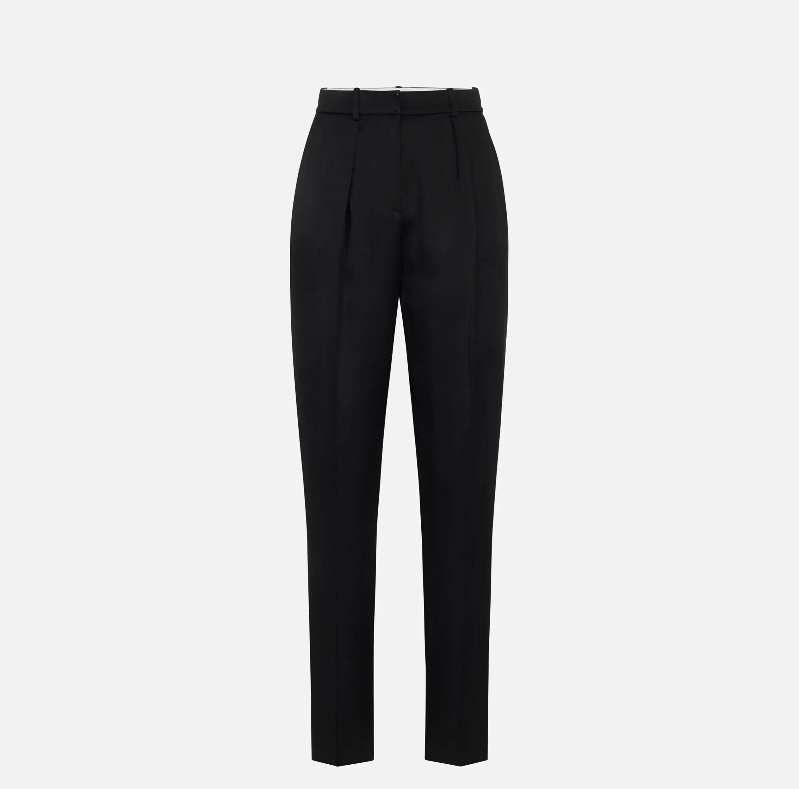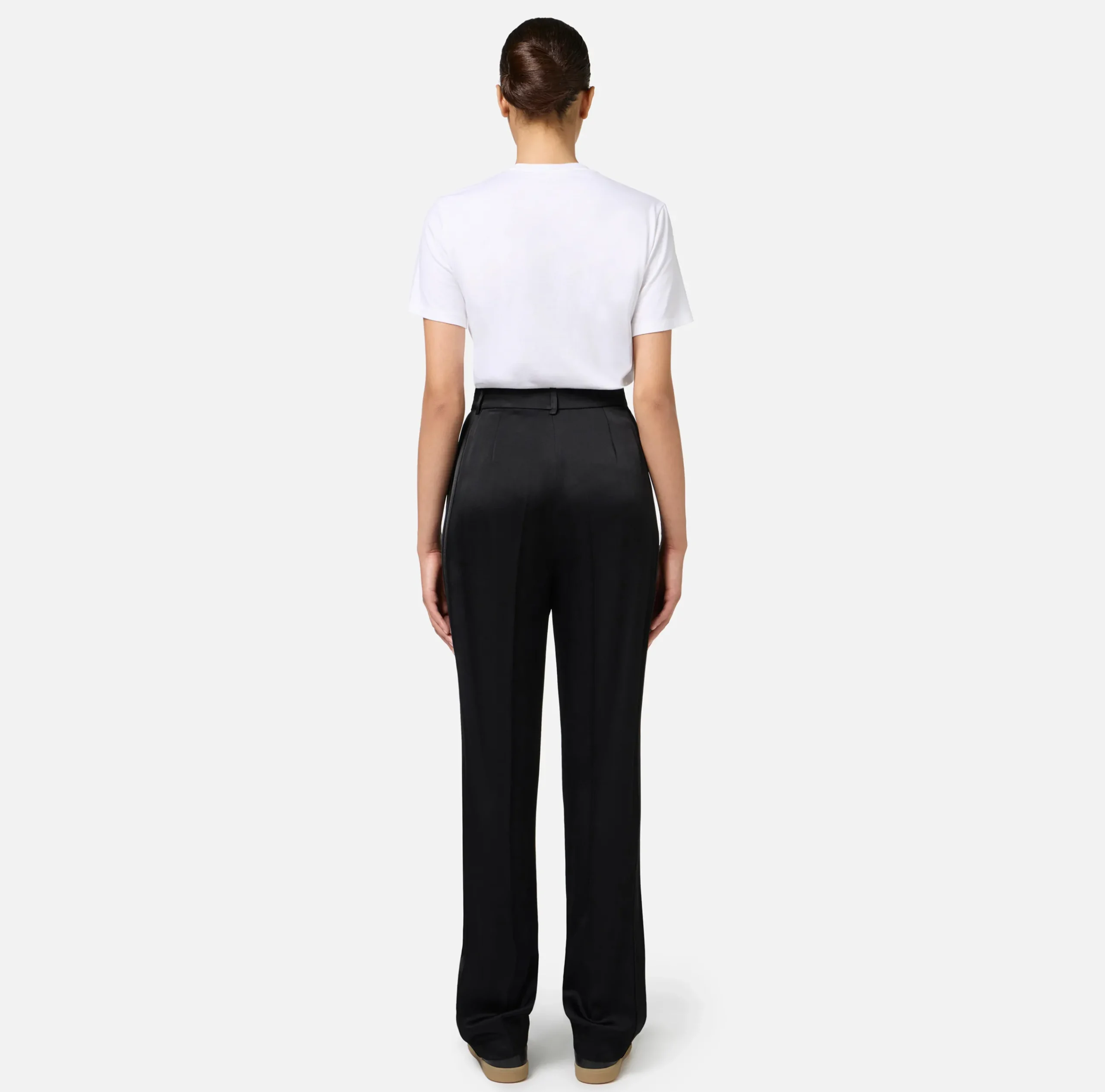 Pantalone dritto in enver satin lucido a vita alta con pinces, tasche alla francese sul davanti e motivo di doppie bande in raso sul fianco.