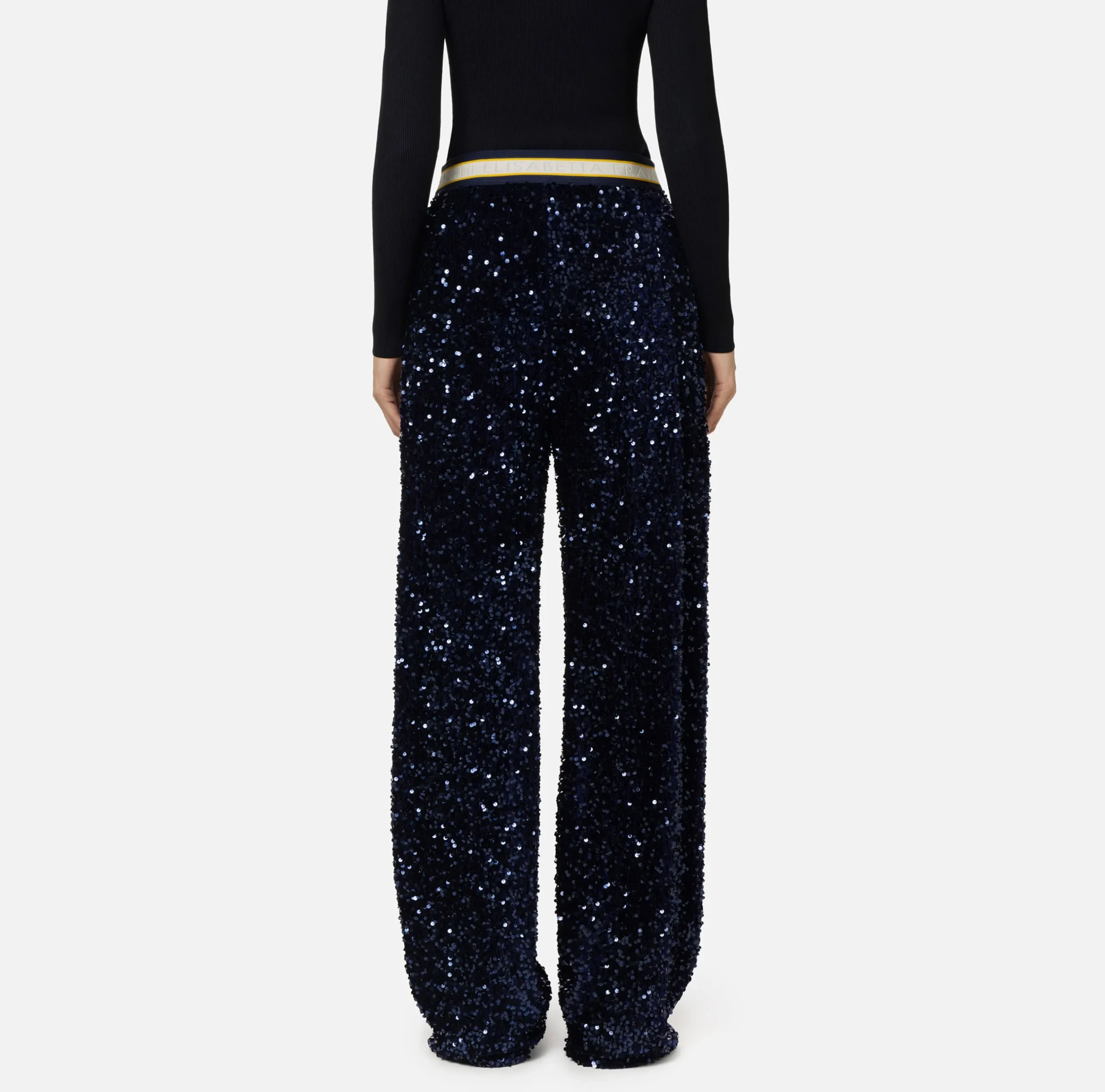 Pantalone in ciniglia ricamata con pailettes con doppie pinces. Il punto vita è enfatizzato da un elastico alto logato a tre colori.