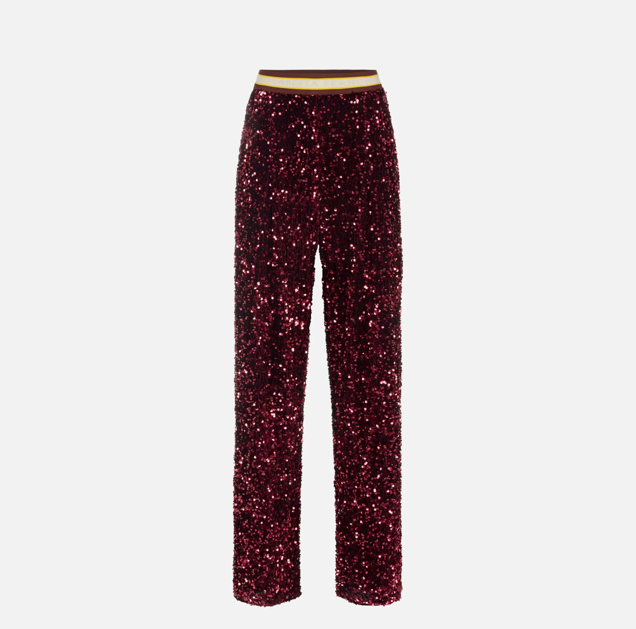 Pantalone in ciniglia ricamata con pailettes con doppie pinces. Il punto vita è enfatizzato da un elastico alto logato a tre colori.