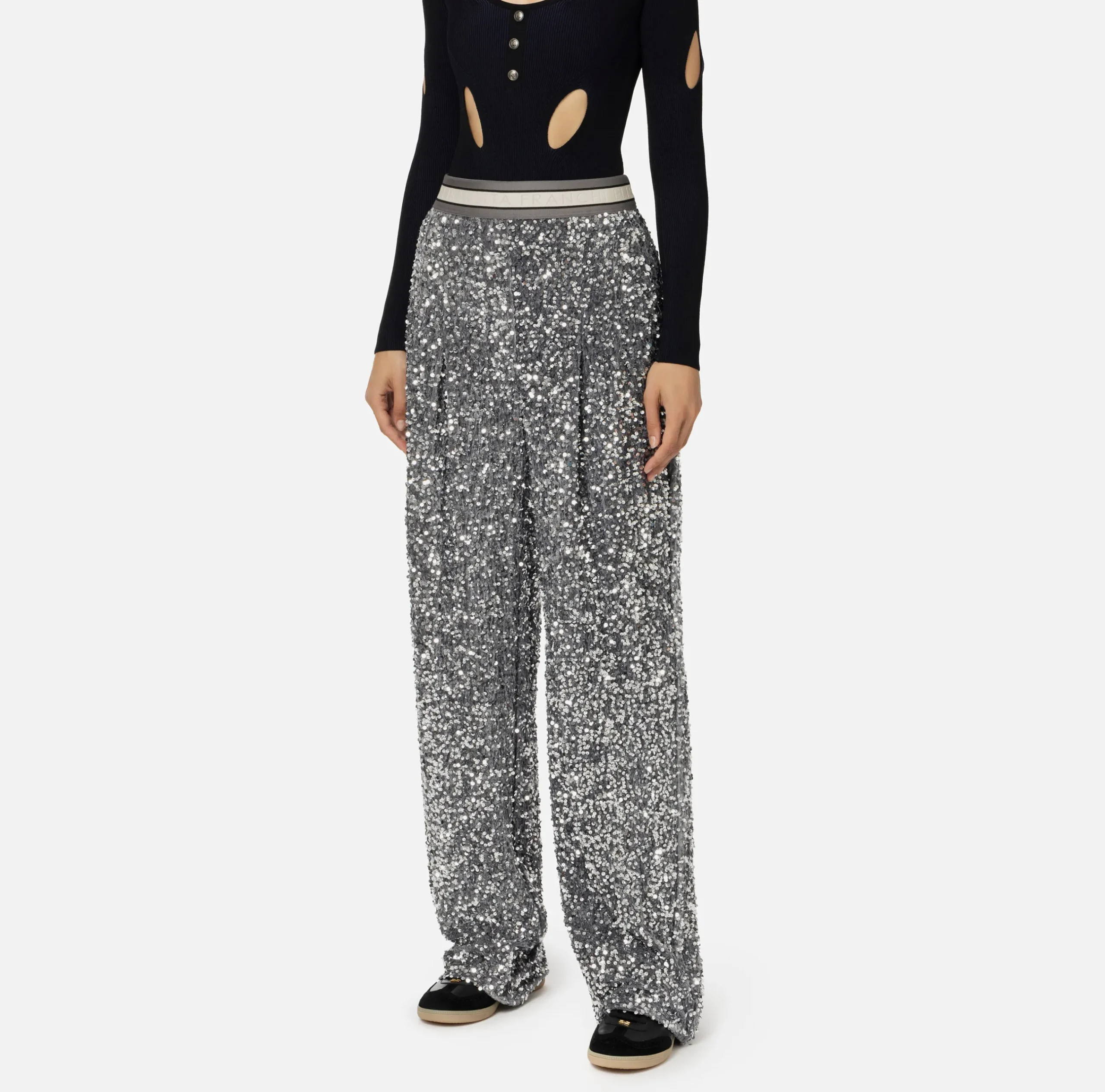 Pantalone in ciniglia ricamata con pailettes con doppie pinces. Il punto vita è enfatizzato da un elastico alto logato a tre colori.