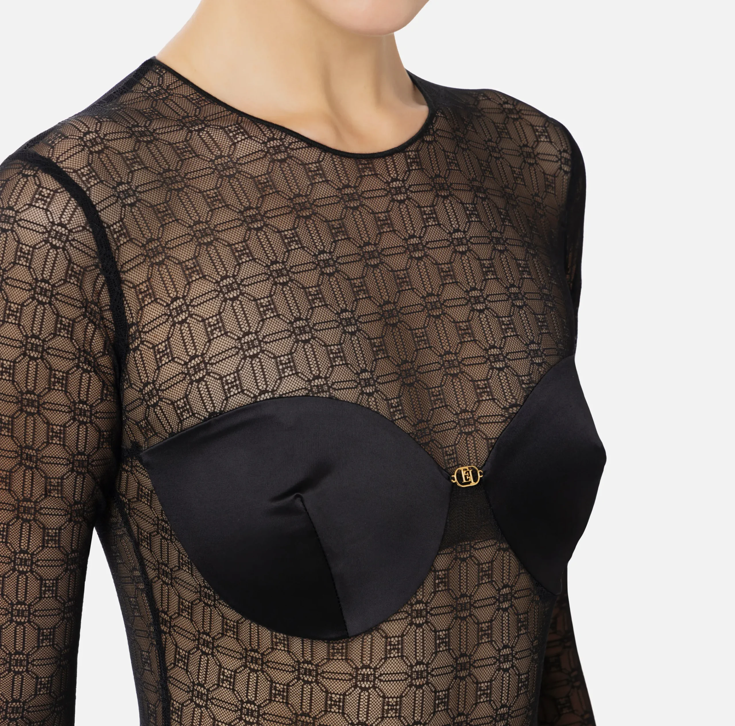 Body in tulle jacquard all-over a maniche lunghe con scollo a giro. È caratterizzato da coppe in lycra rifinite da una placca logo in metallo dorato.