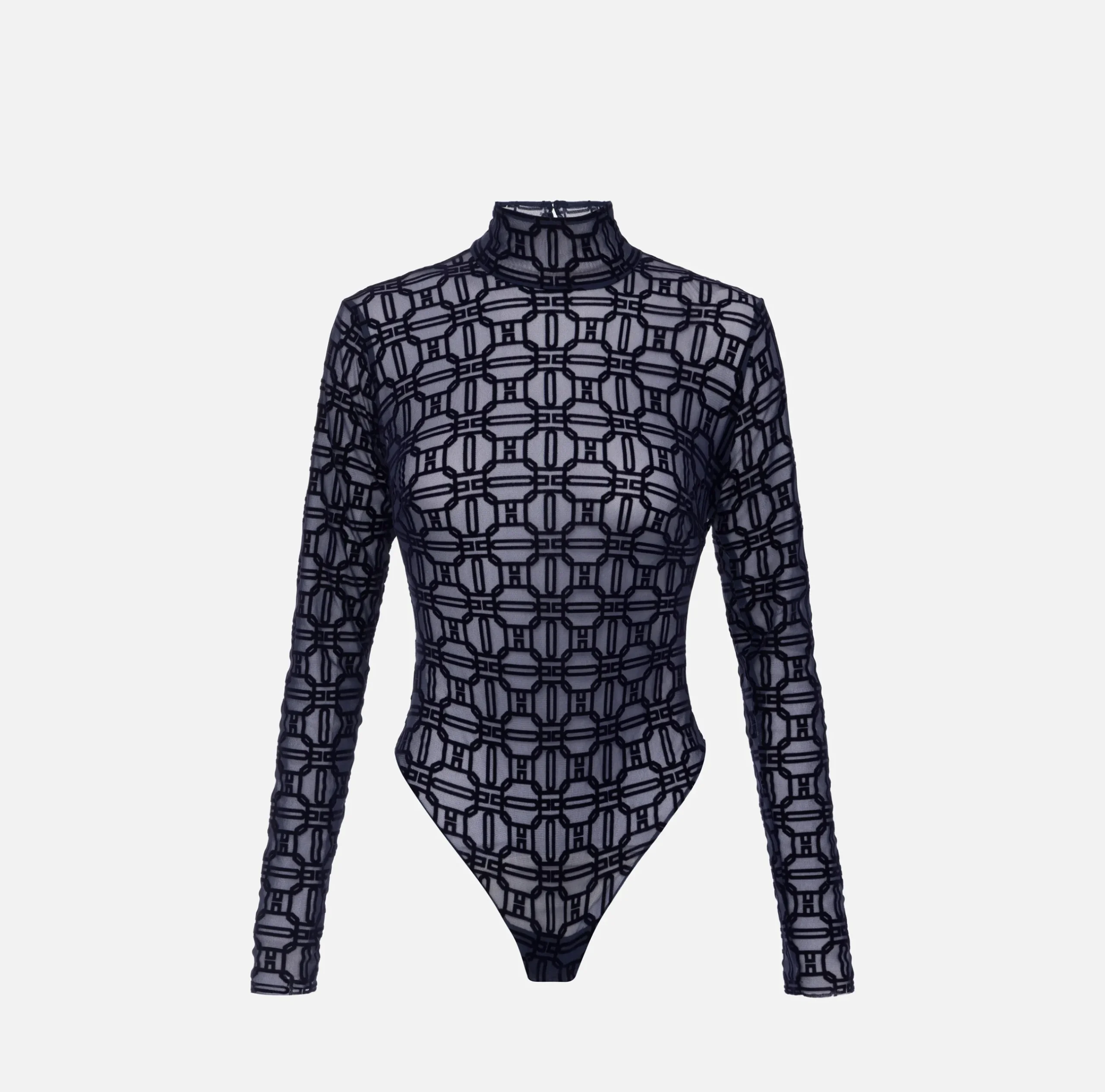 Body in tulle stretch logo flock a maniche lunghe. È caratterizzato da collo alto con apertura a goccia sulla schiena.