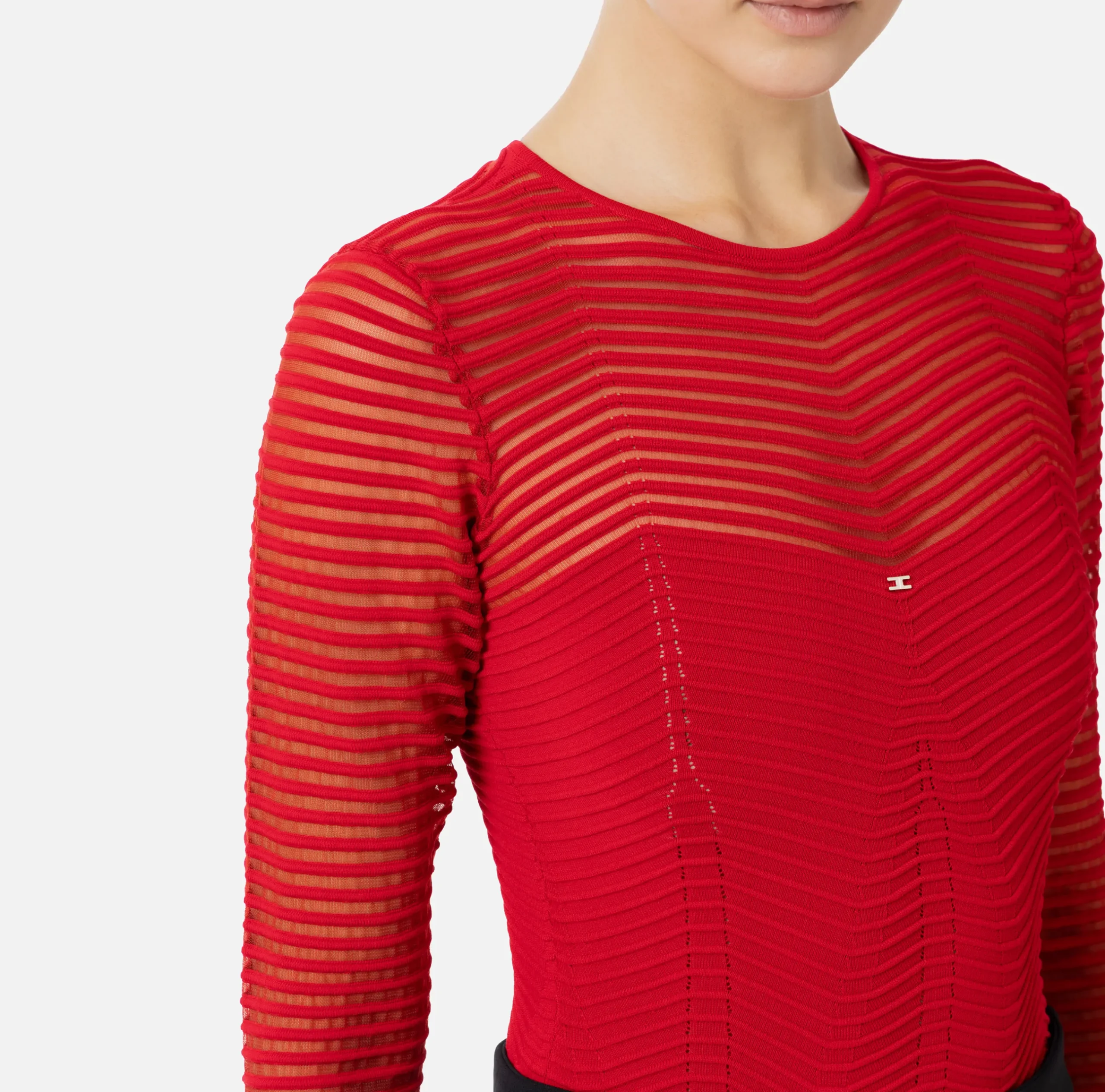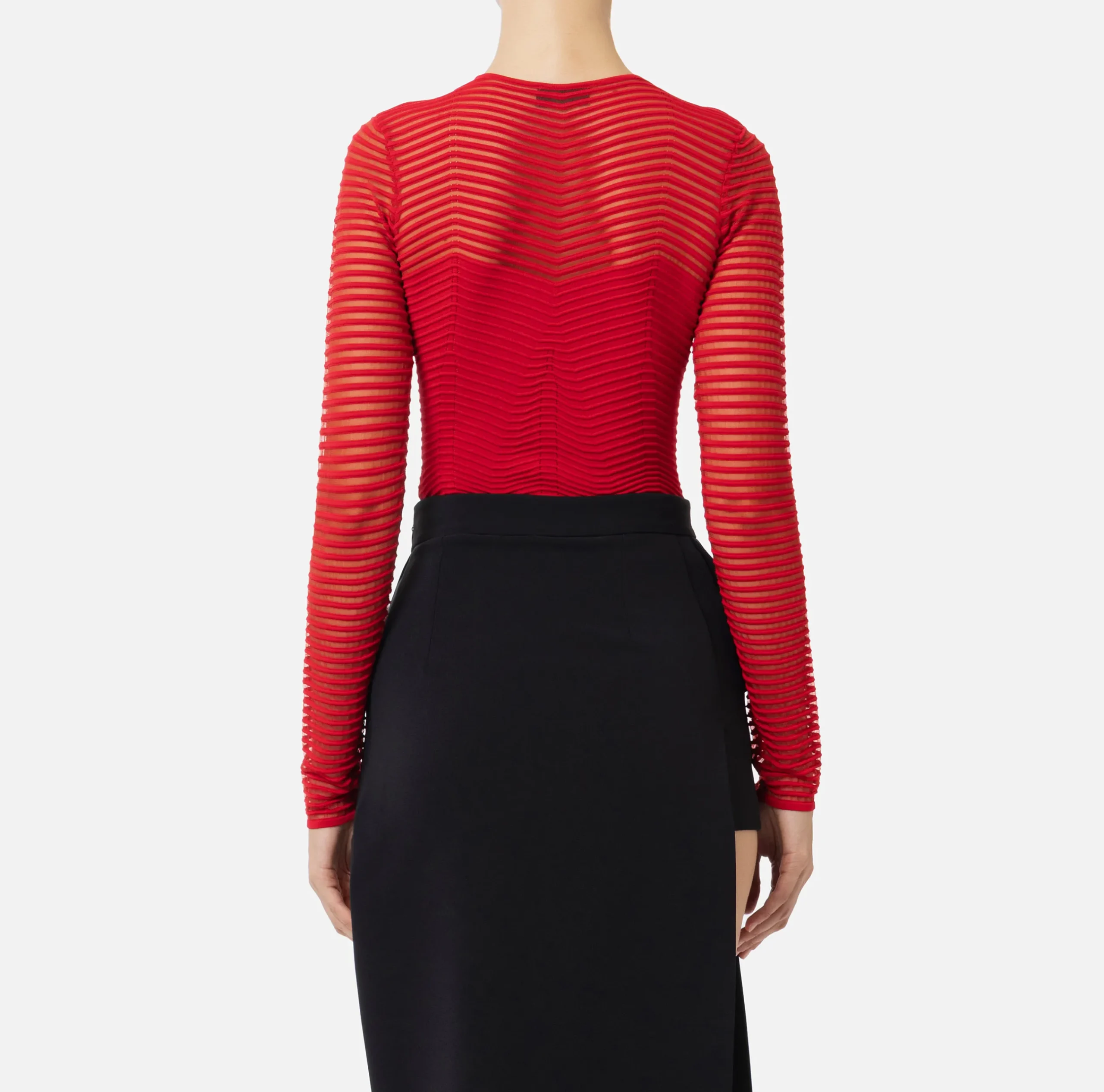 Body in viscosa motivo chevron tridimensionale alternato a un punto rete. È caratterizzato da maniche lunghe trasparenti e scollo a giro.
