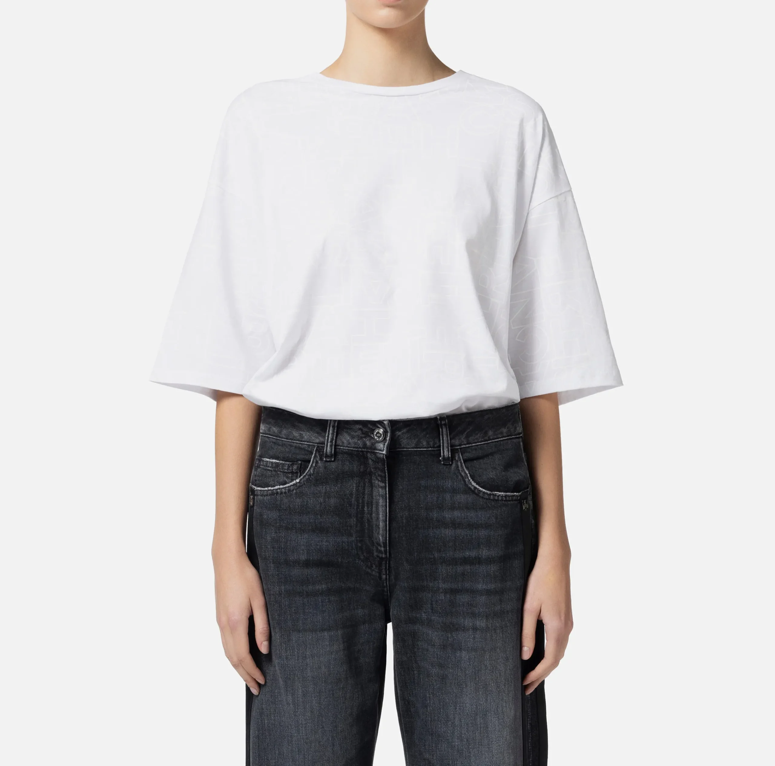 T-shirt in jersey di cotone con lettering lucido all-over in tono. È caratterizzata da maniche con spalle scese.