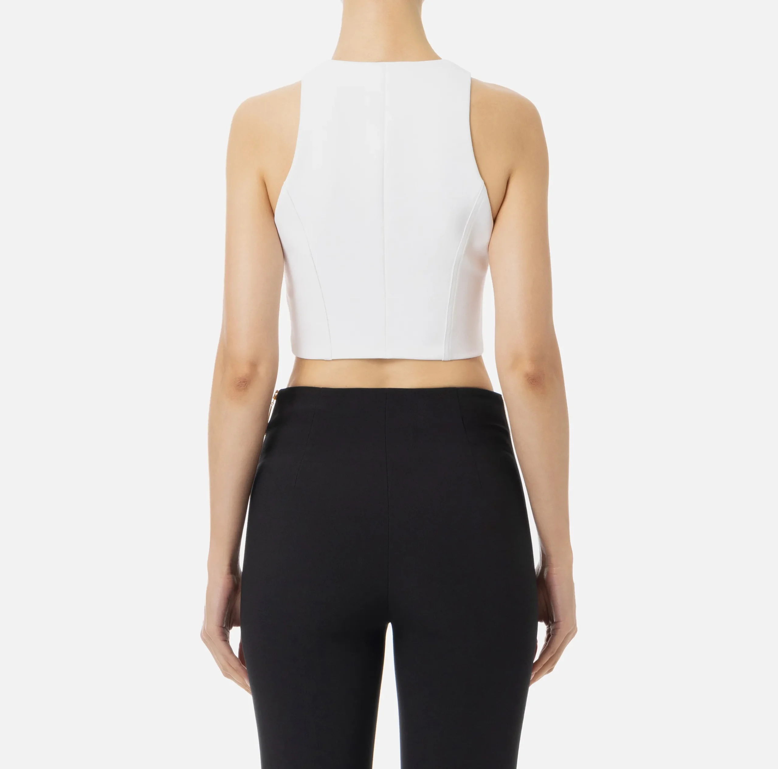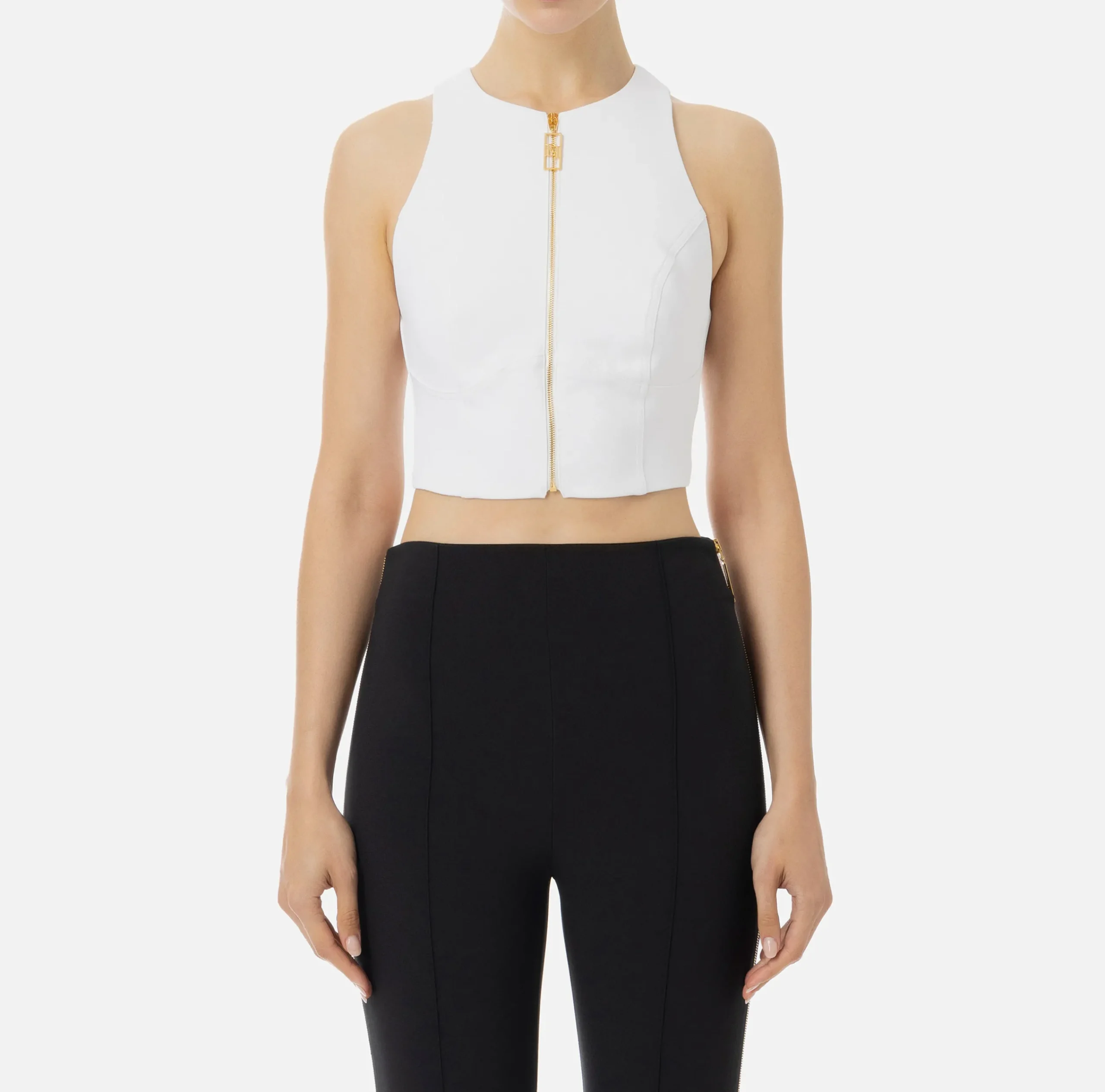 Top cropped in doppio crêpe stretch con scollo olimpionico. È caratterizzato da zip sul davanti con tiretto logo in metallo dorato.
