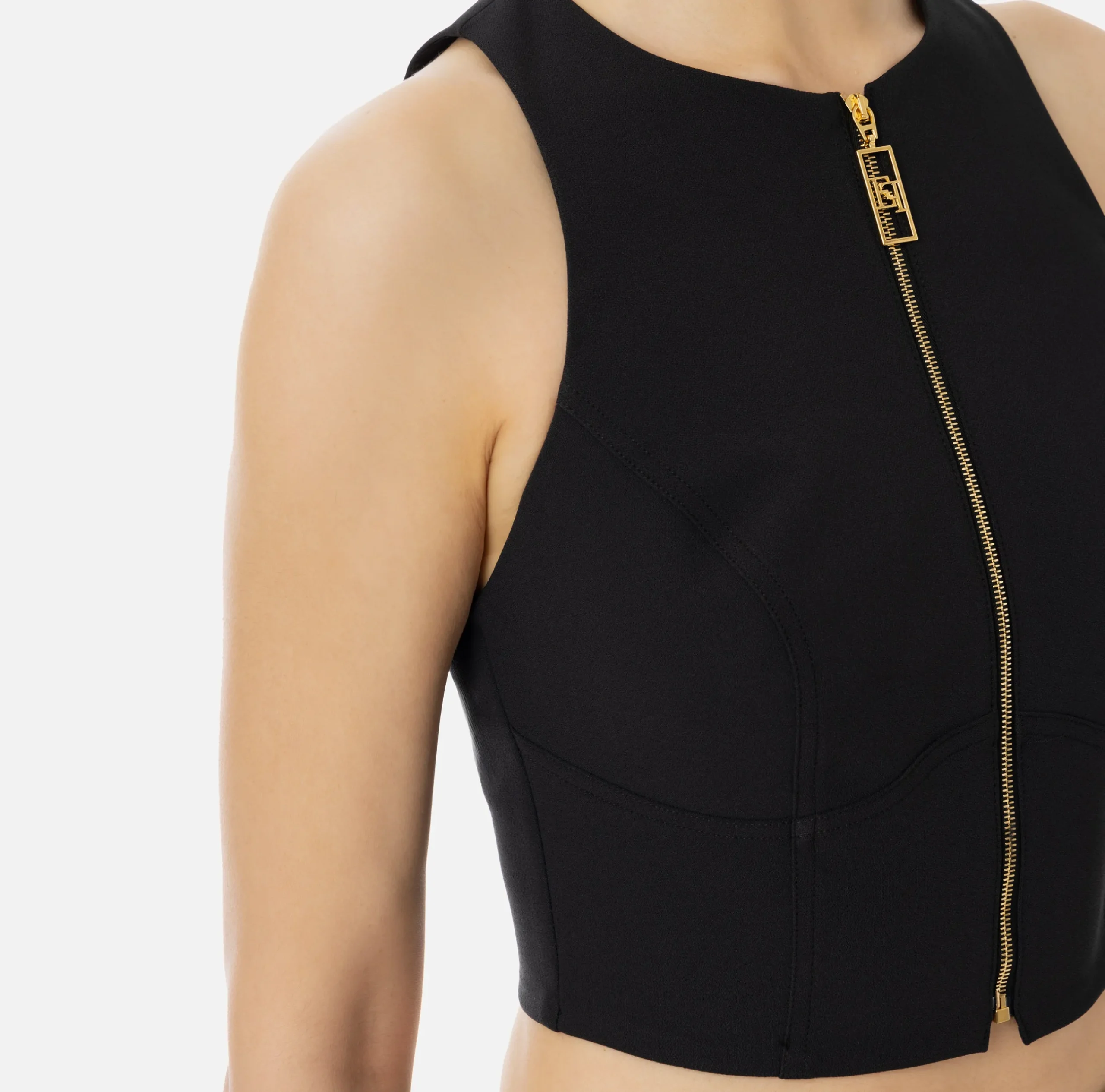 Top cropped in doppio crêpe stretch con scollo olimpionico. È caratterizzato da zip sul davanti con tiretto logo in metallo dorato.