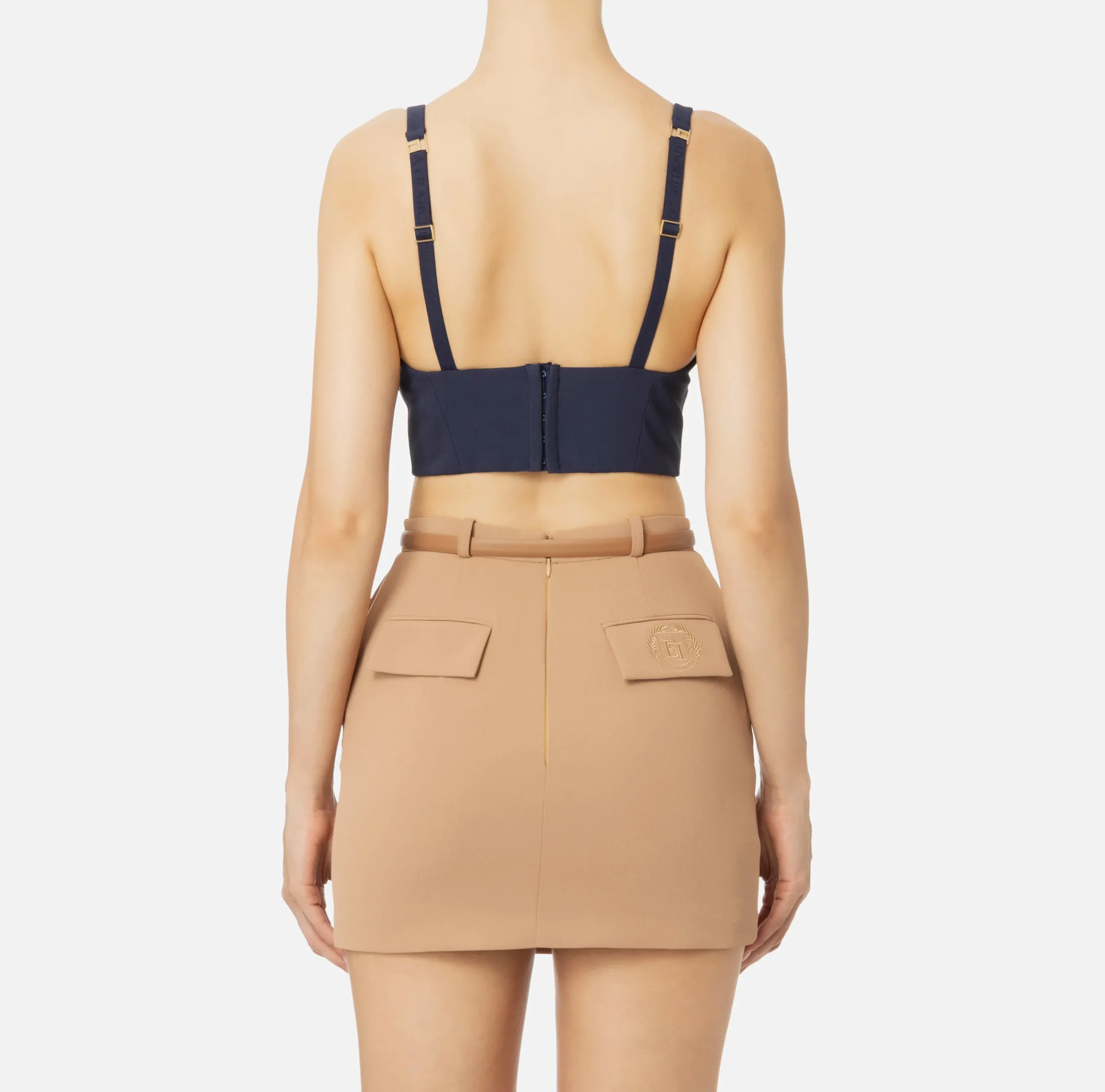 Top in doppio crêpe stretch con spalline sottili. Applicazione di una placca logo in metallo dorato sul davanti.