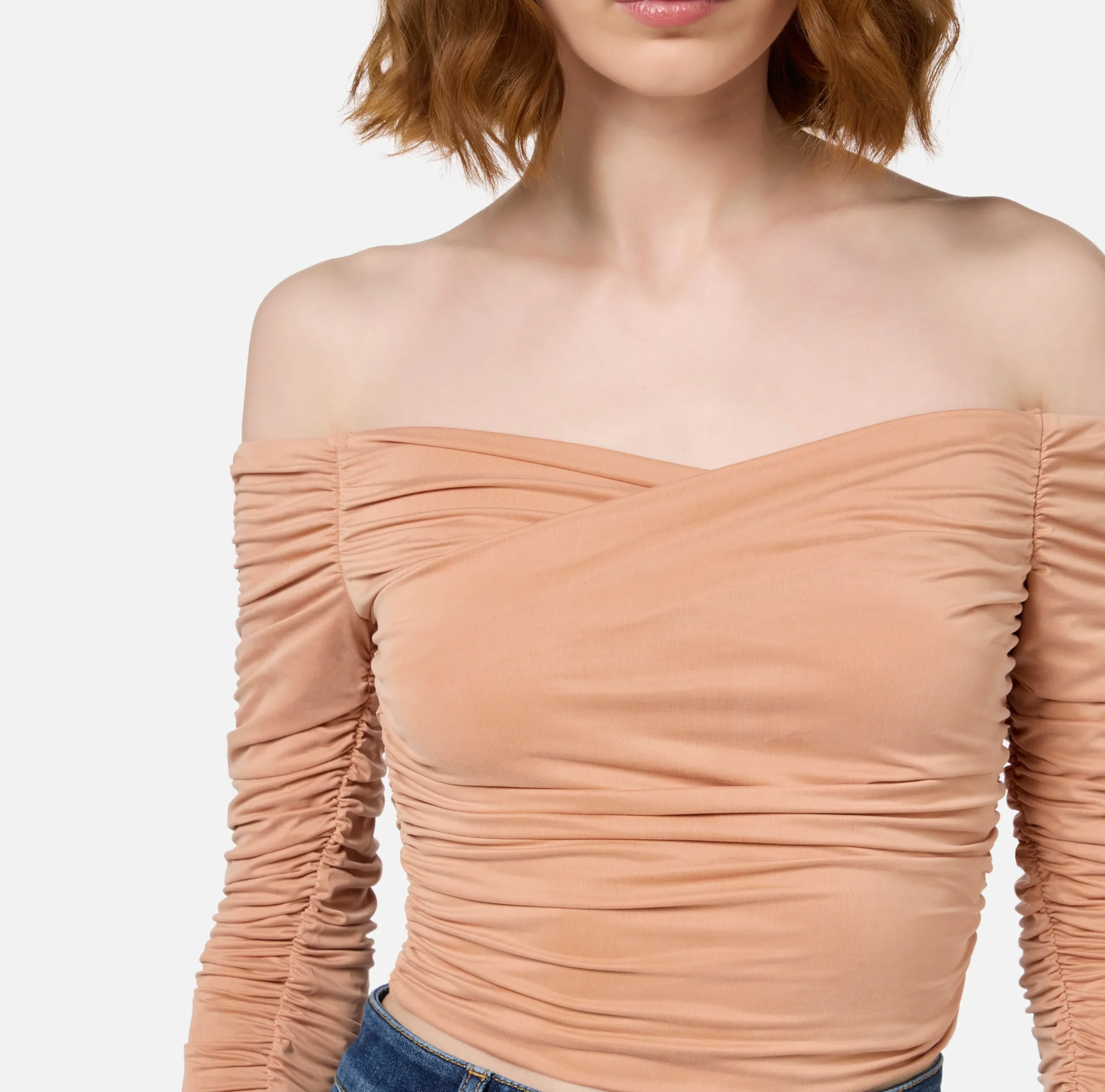 Top in jersey cupro drappeggiato con scollo sceso incrociato sul davanti e maniche a guanto. È caratterizzato da zip in metallo dorato e tiretto logo sul dietro.