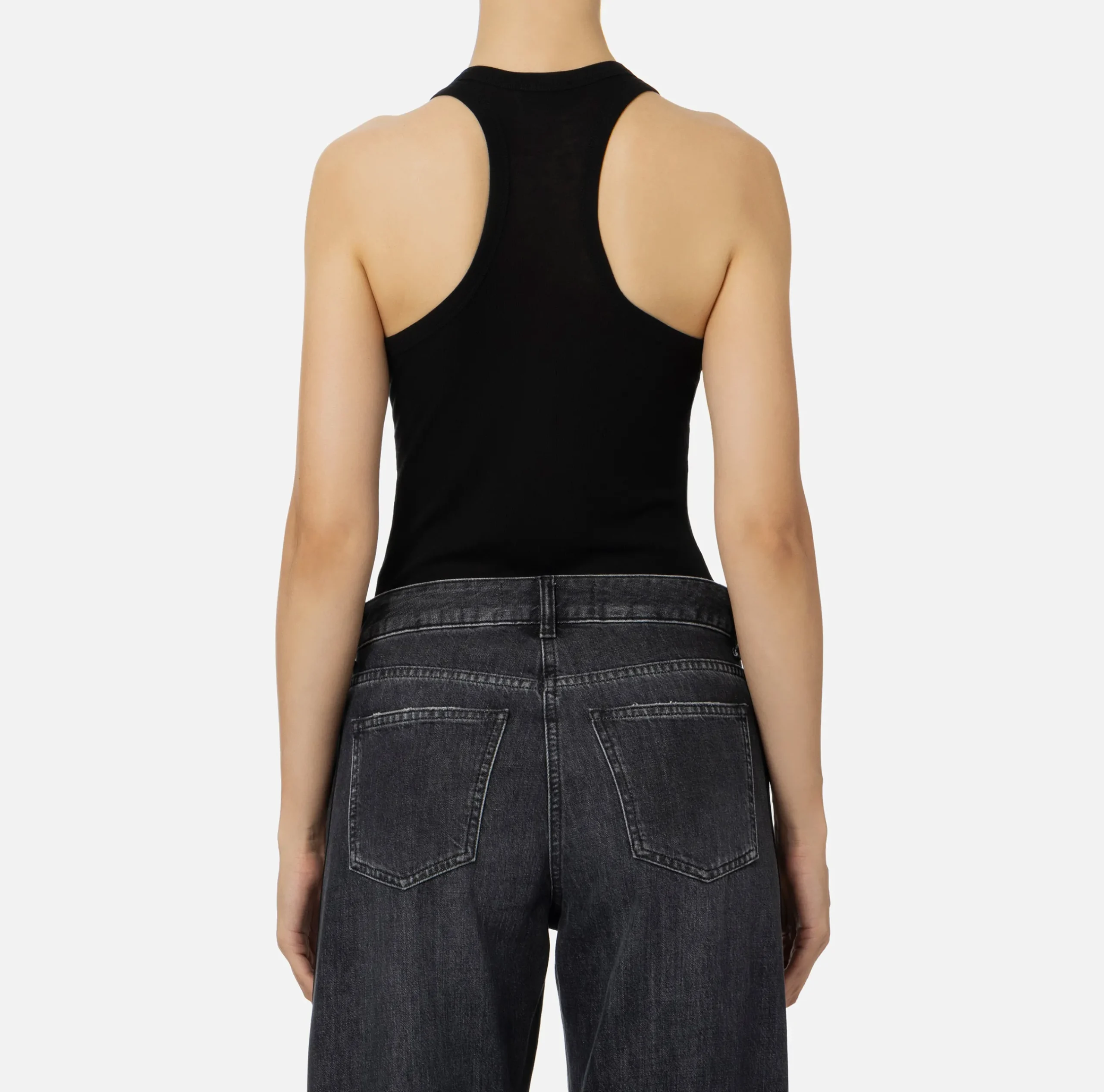 Top in jersey leggerissimo misto lana con scollo all’americana. È caratterizzato da stampa logo in contrasto.
