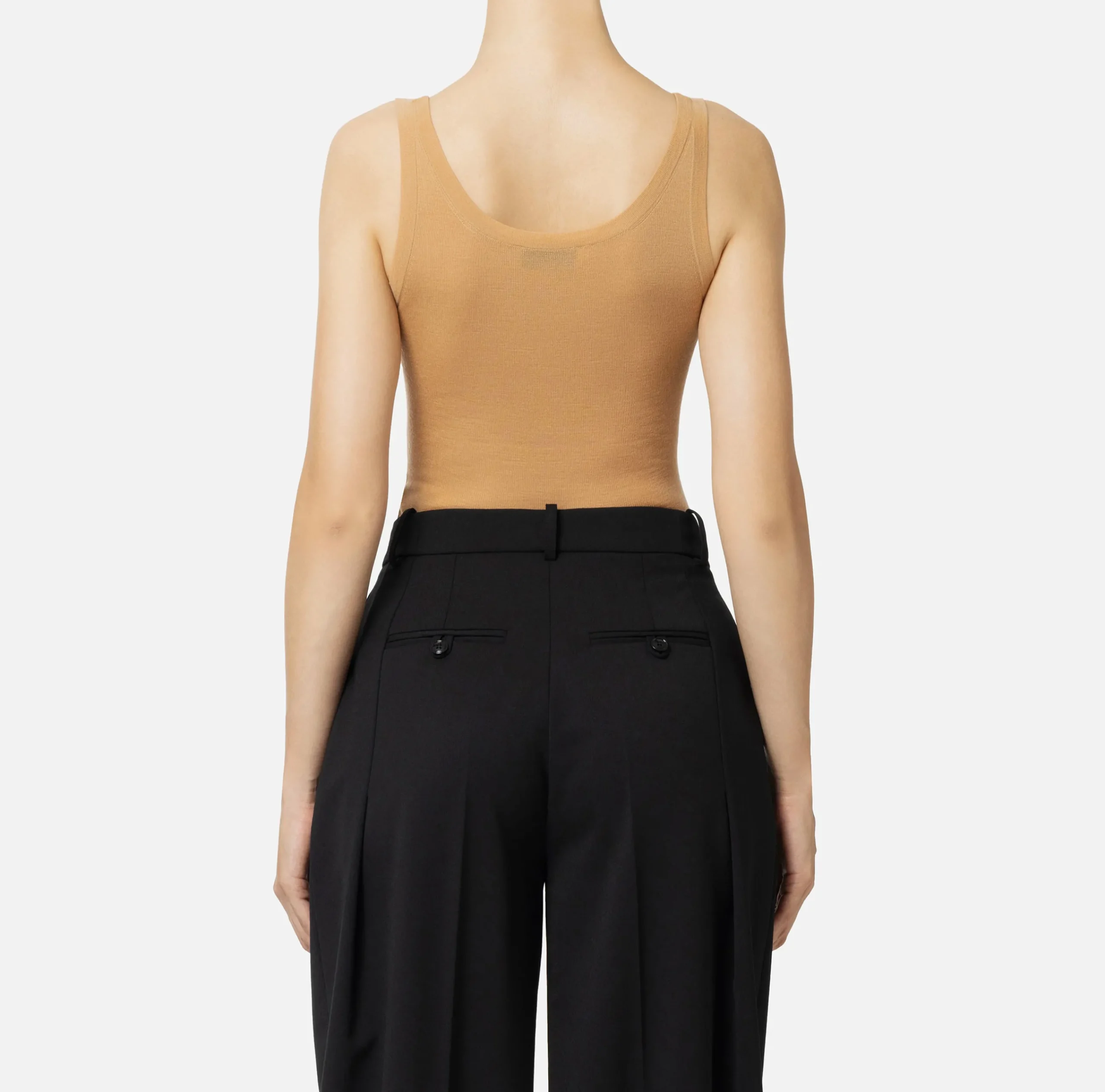 Top in lana merino con logo jacquard in contrasto colore sul collo.