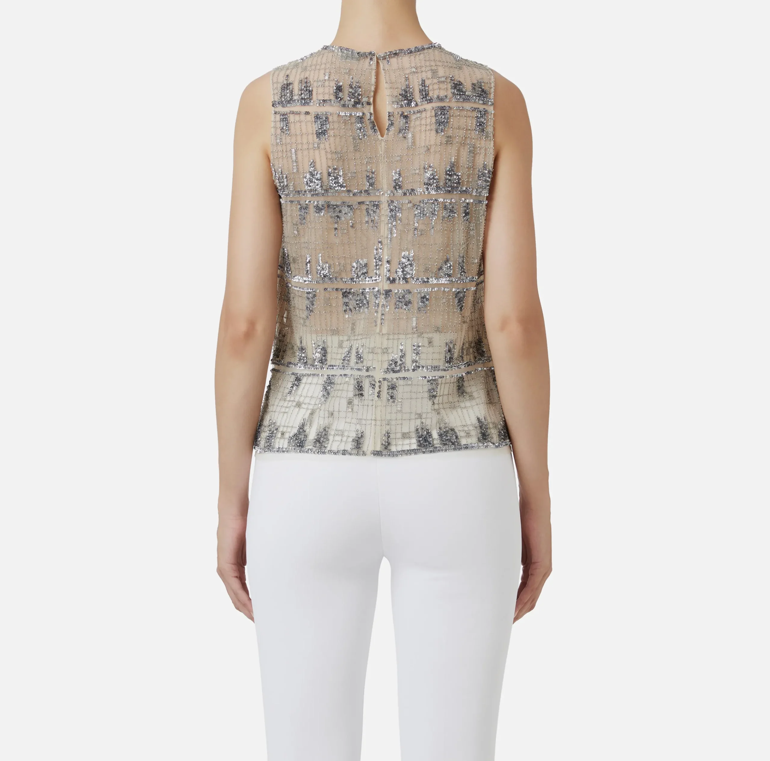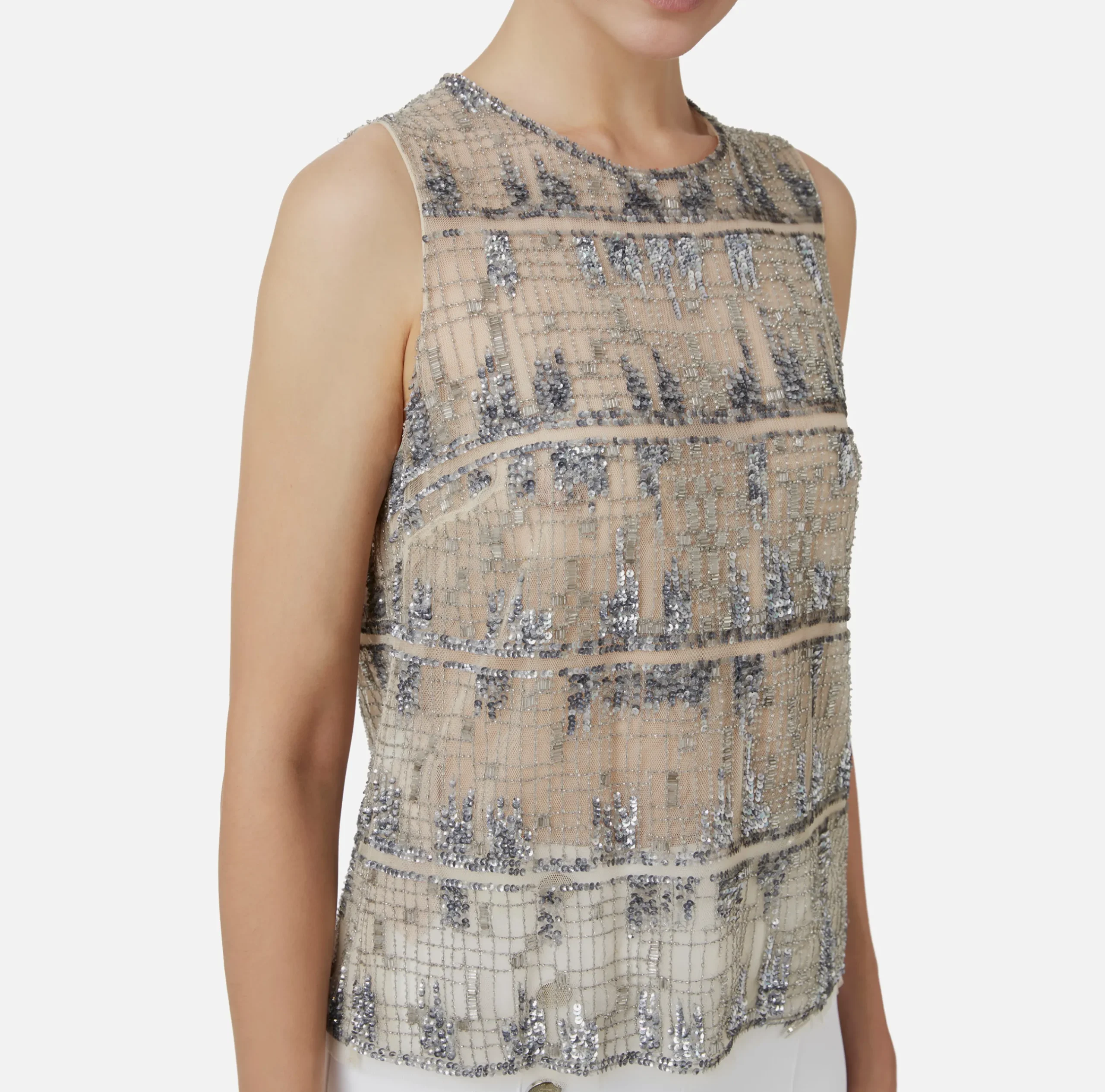 Top in tulle interamente ricamato a mano con paillettes cuvettes e canottiglie orizzontali disegno effetto pixel. È caratterizzato da scollo a giro.