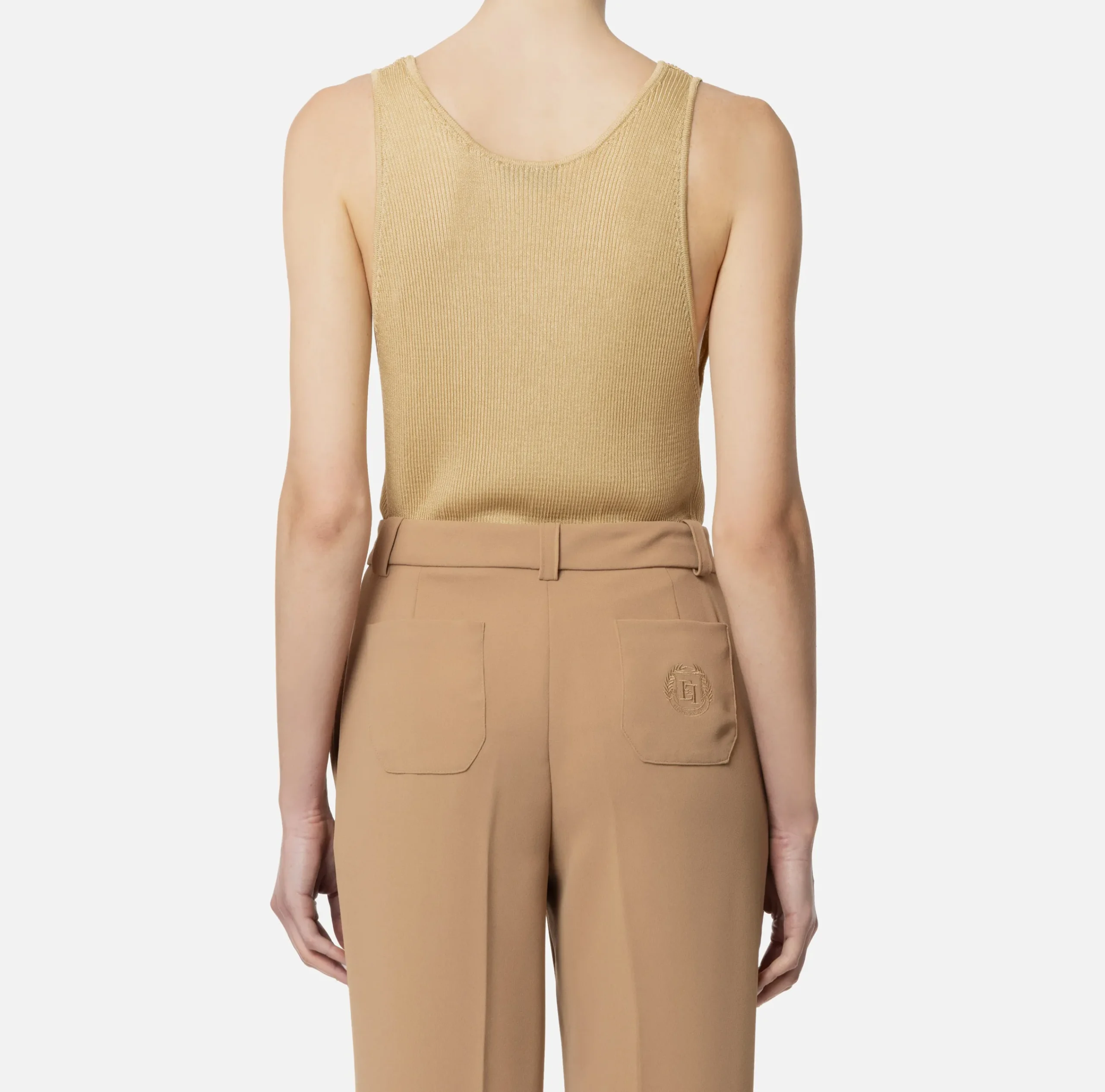 Top smanicato in viscosa a costina plissé con profondo scollo a giro. È caratterizzato da una placca logo in metallo dorato sulla spalla.