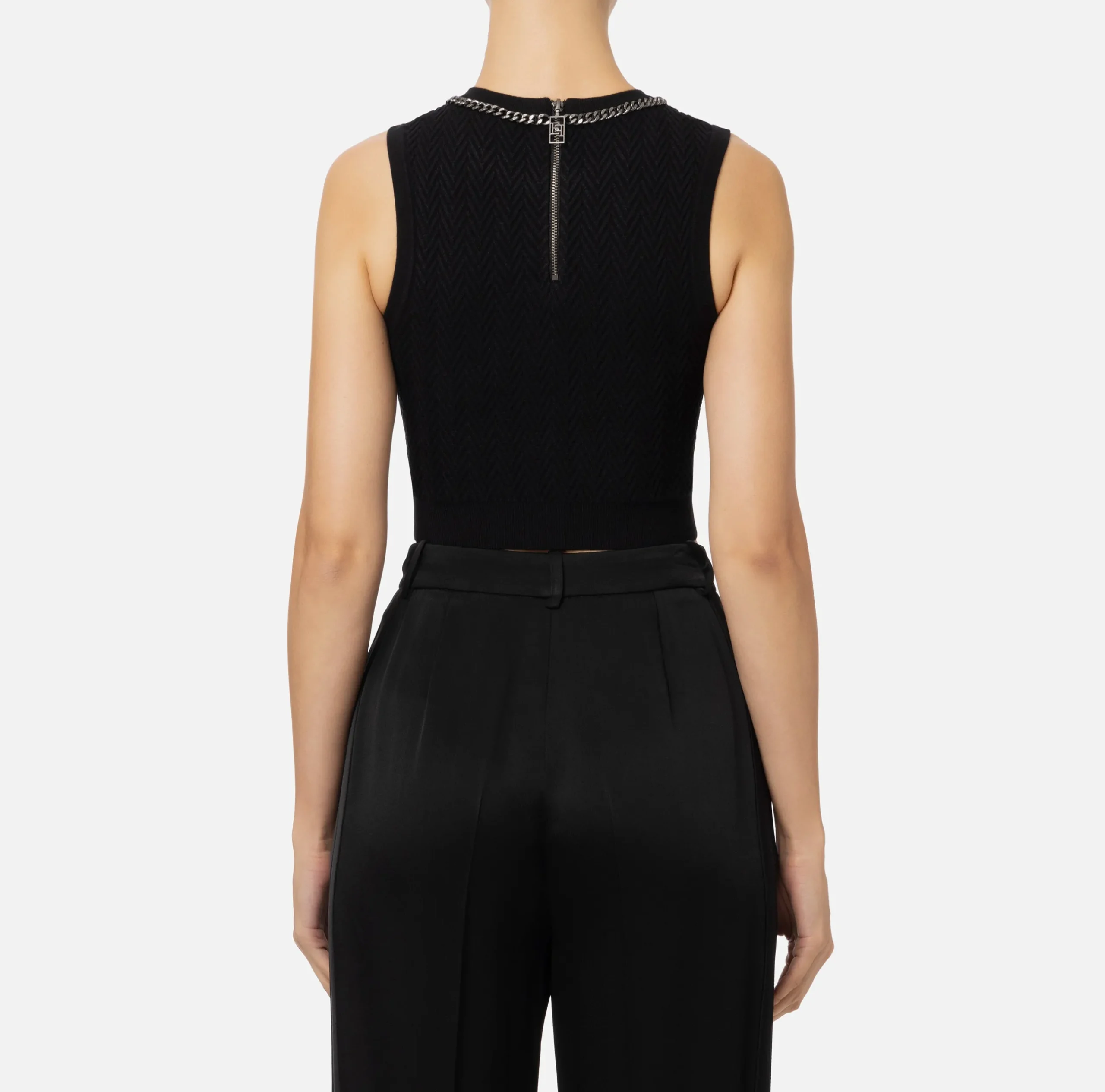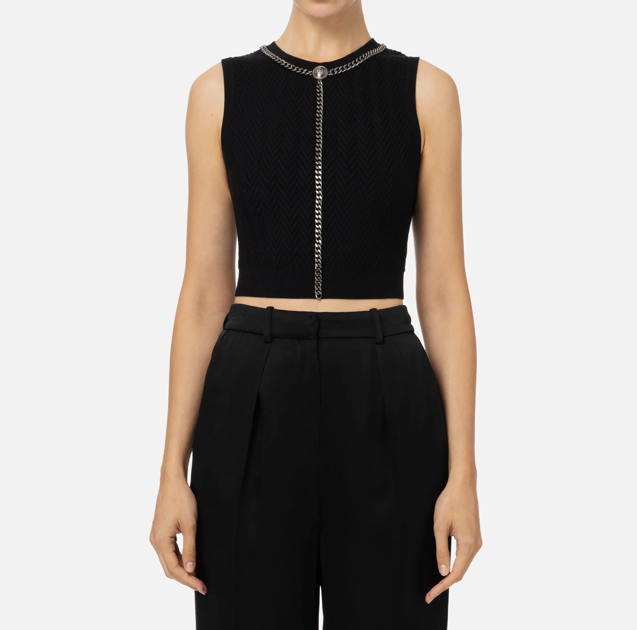 Top smanicato in misto viscosa punto resca con scollo a giro. È caratterizzato da una catena in metallo silver con bottone logato che segue lo scollo e scende lungo il centro davanti.