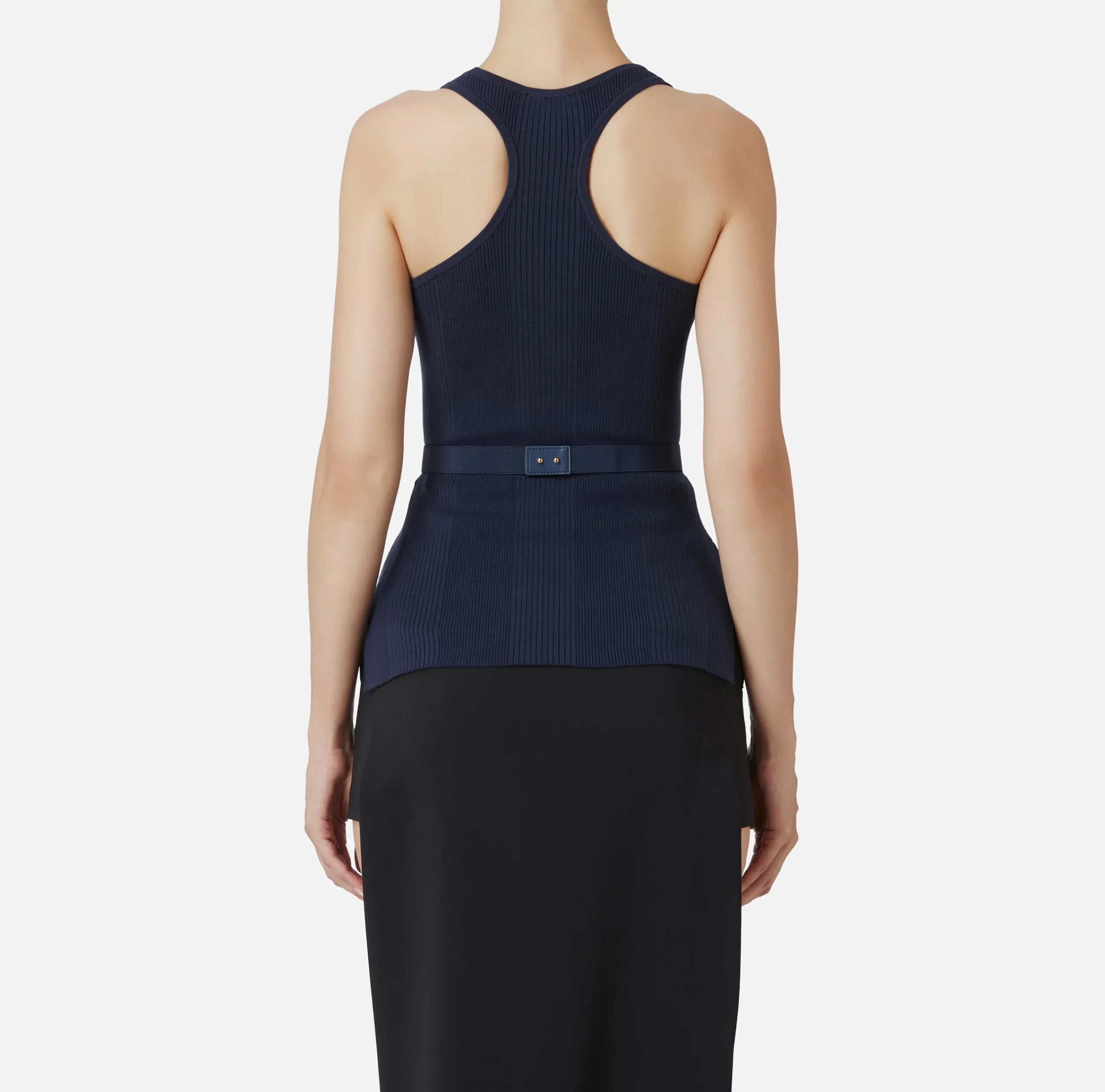 Top in viscosa e seta a costine con scollo all’americana e tasche con ricamo logo rifinite da bottoni in metallo dorato. Il punto vita è enfatizzato da una cintura in elastico con fibbia in metallo dorato.