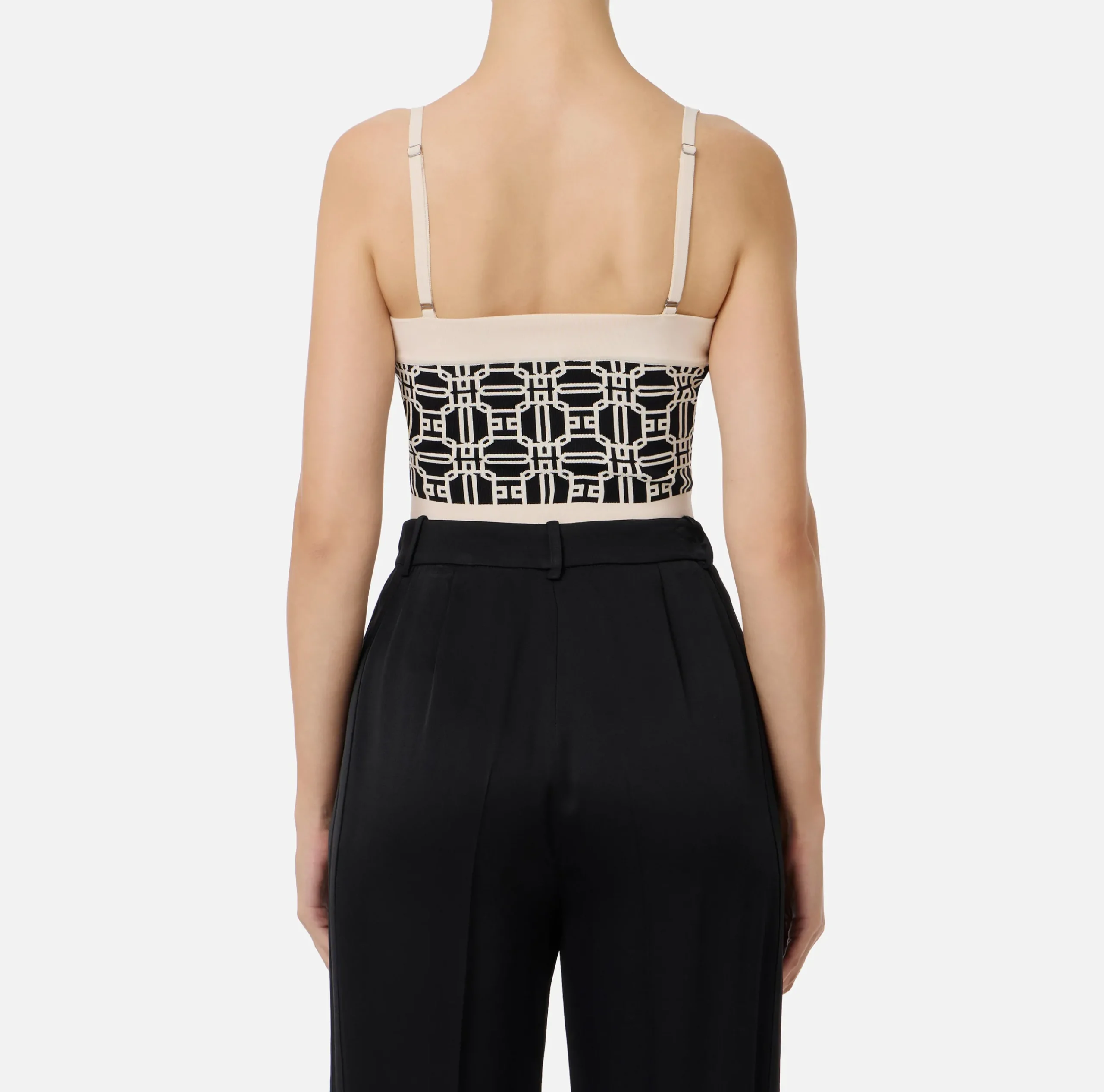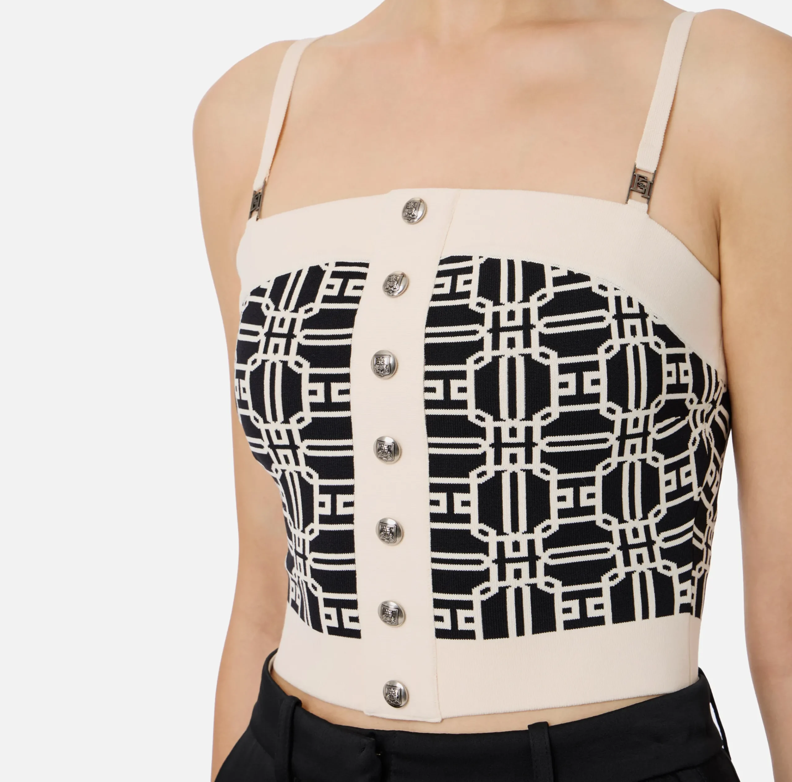 Top a fascia in misto viscosa stampa logo jacquard con spalline. È caratterizzata da finta abbottonatura e finiture in contrasto colore.