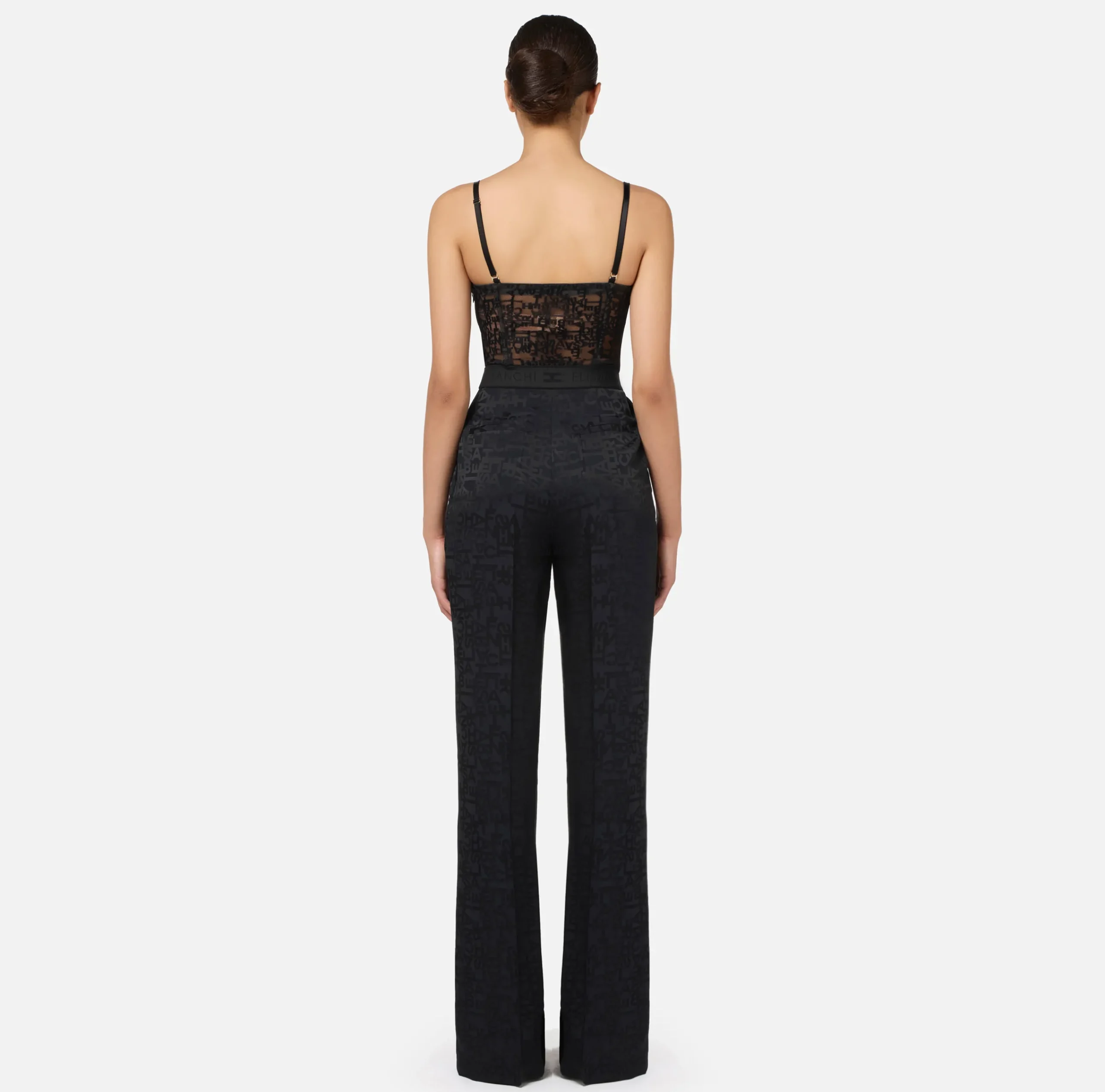 Tuta composta da top bustier in tulle jaquard lettering e pantalone palazzo in crêpe jaquard lettering. Il punto vita è enfatizzato da una cintura in elastico logato.