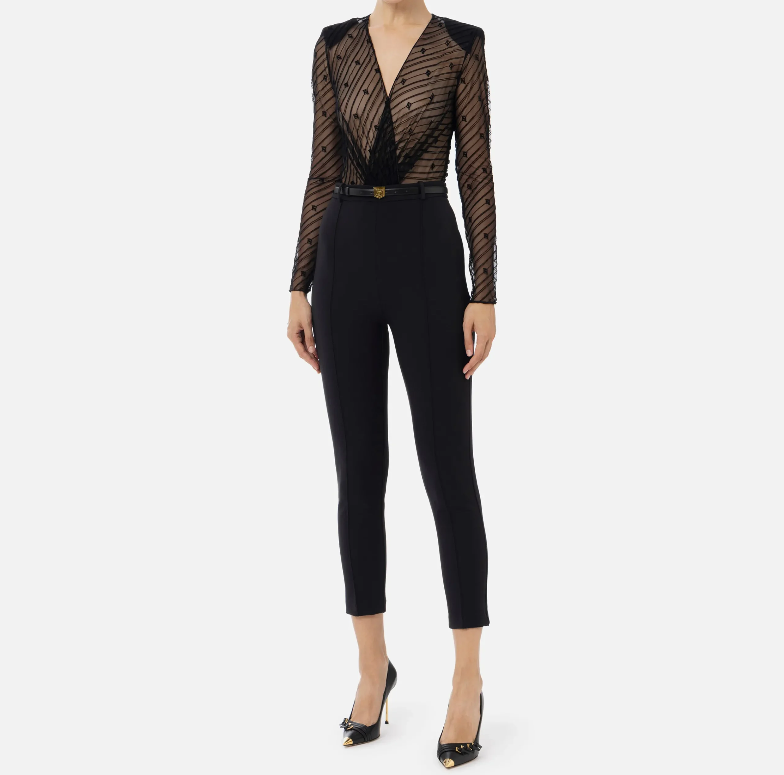 Tuta composta da top staccabile in tulle flock disegno diagonale a maniche lunghe con profonda scollatura incrociata sul davanti e pantalone dritto in doppio crêpe stretch. Il punto vita è enfatizzato da una cintura con fibbia in metallo dorato.