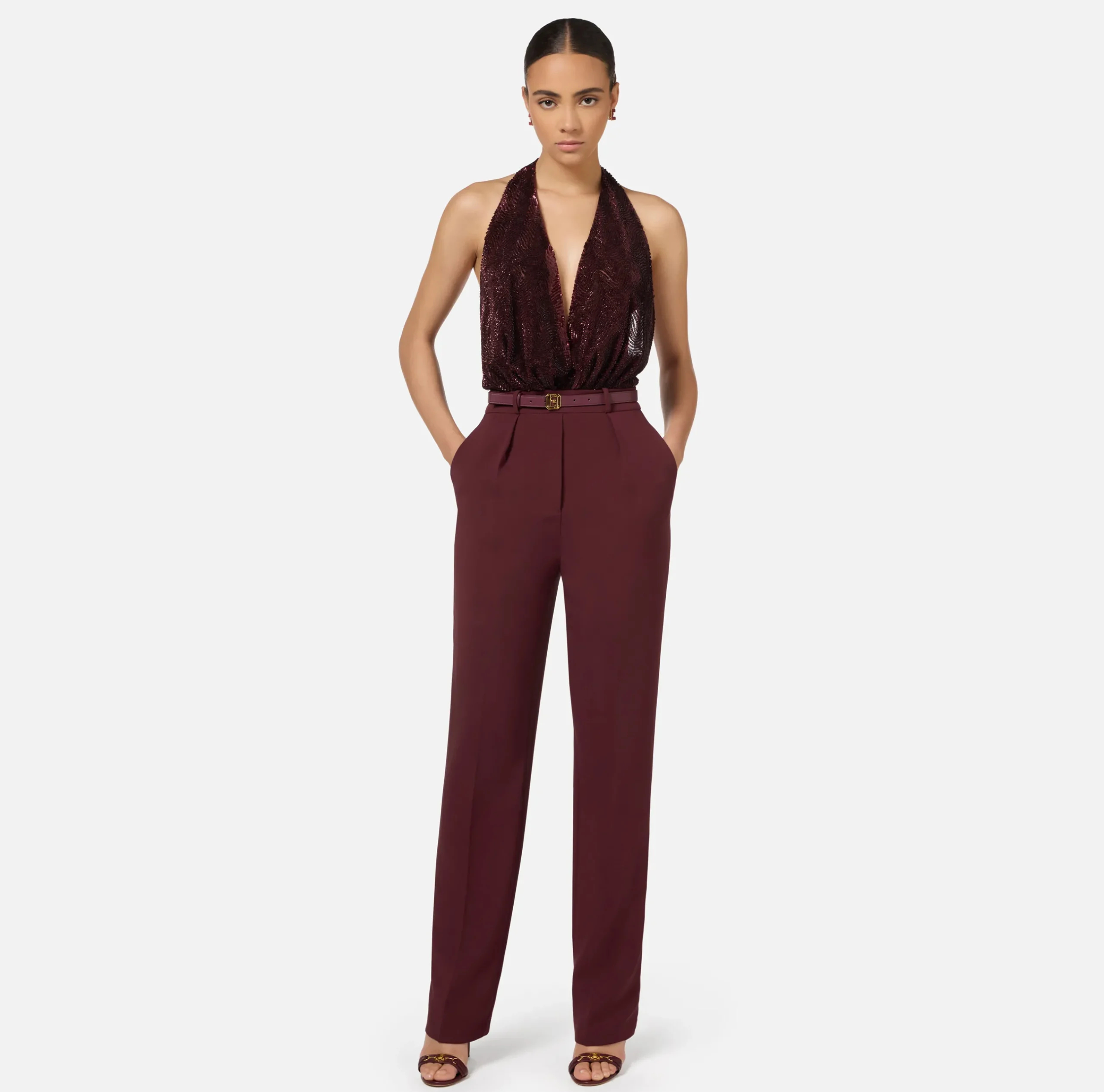 Tuta composta da top in tulle interamente ricamato a mano con paillettes cuvettes con profondo scollo all’americana e pantalone in crêpe a gamba dritta con pinces. Il punto vita è enfatizzato da una cintura in materiale sintetico effetto pelle con fibbia logo in metallo dorato.