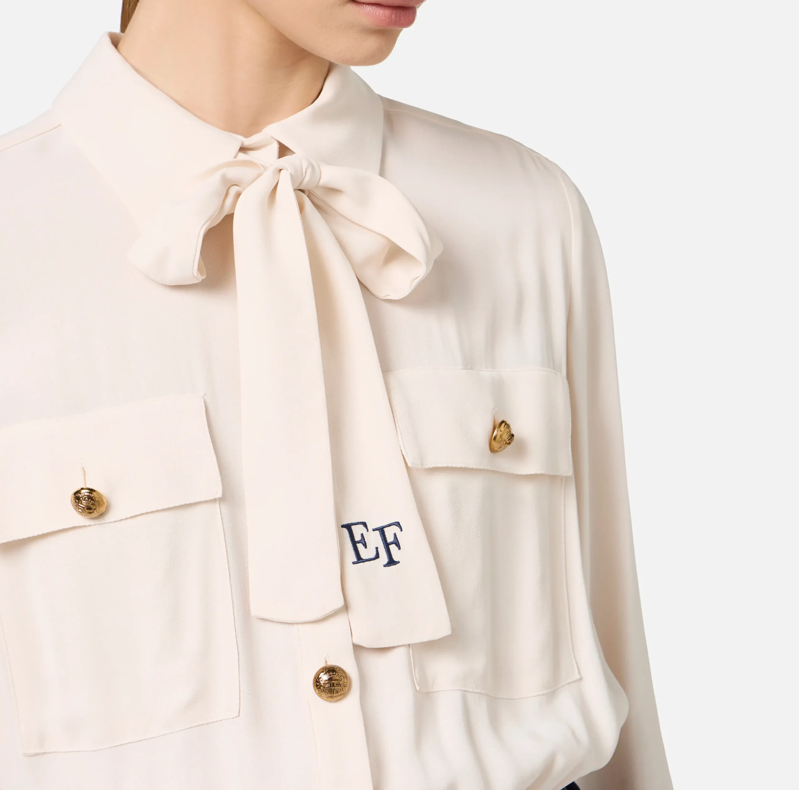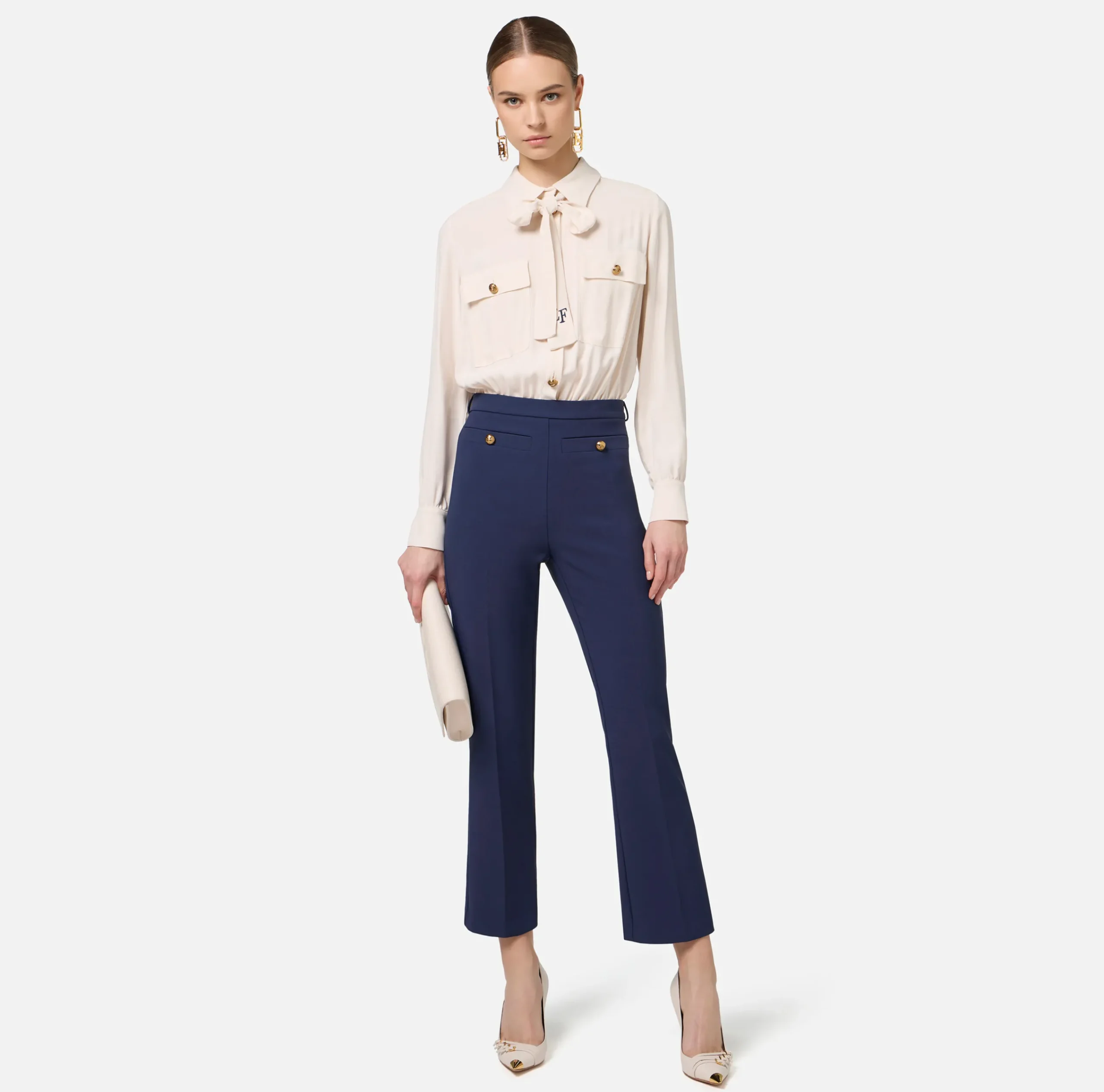 Tuta composta da camicia staccabile in doppia georgette di viscosa a maniche lunghe e pantalone a zampetta in doppio crêpe stretch alla caviglia. È caratterizzata da fiocco logato al collo.