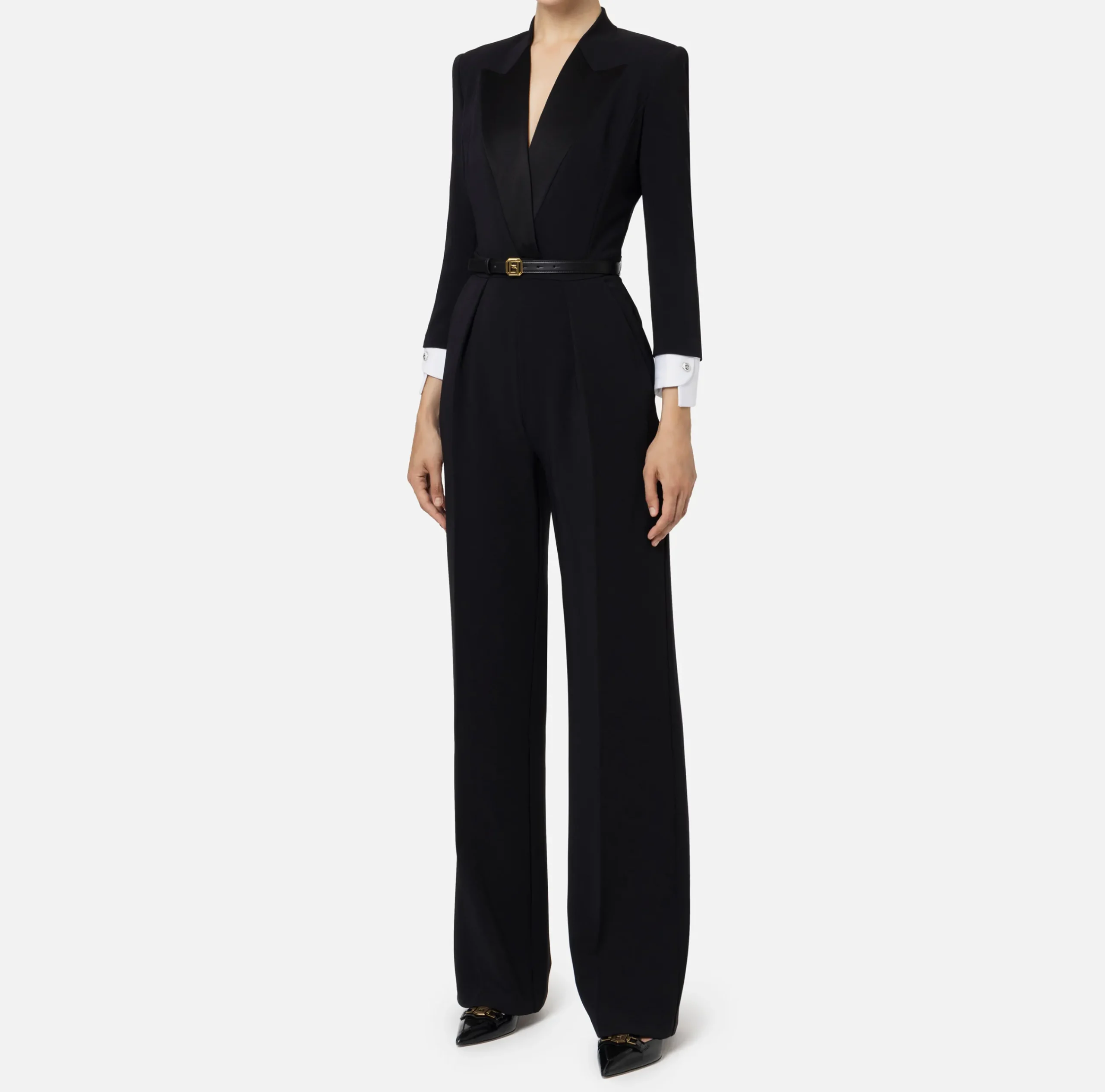 Tuta in crêpe stretch composta da giacca con maniche a ¾ con polsi staccabili, revers a lancia in raso e pantalone dritto con pinces. Il punto vita è enfatizzato da cintura in materiale sintetico effetto pelle con placca smaltata.