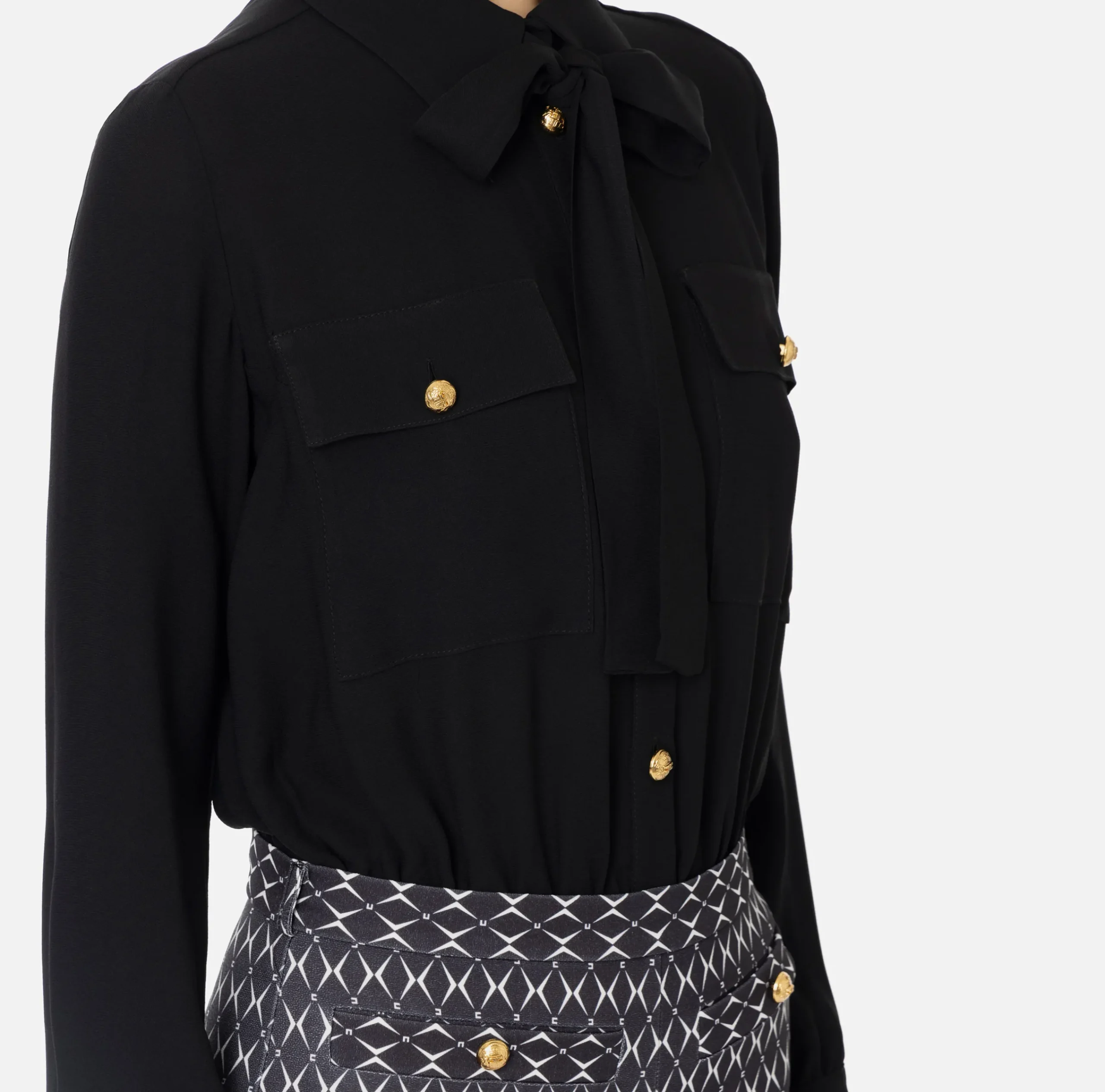Tuta composta da camicia staccabile in doppia georgette di viscosa a maniche lunghe e pantalone a zampetta in doppio crêpe stretch stampa rombo. È caratterizzata da fiocco logato al collo.