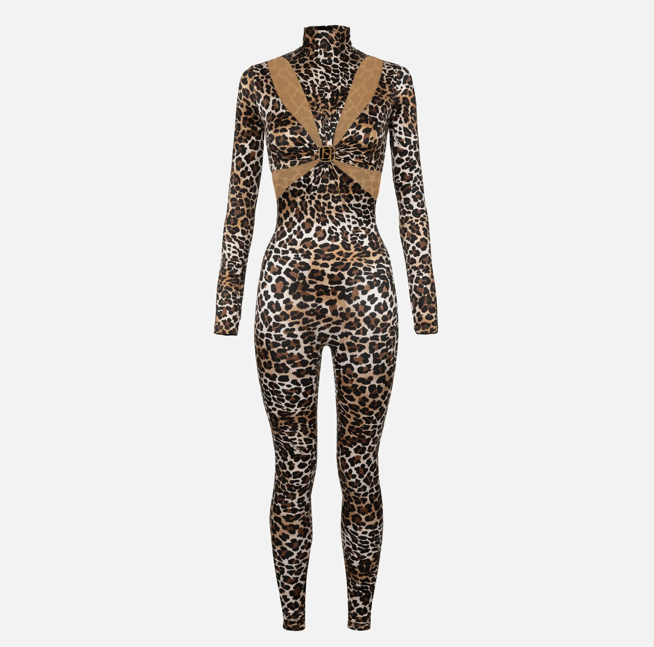 Tuta in lycra lucida stampa animalier a collo alto con maniche lunghe a guanto e pantaloni skinny. È caratterizzato da motivo cut-out trattenuto da una placca logo in metallo dorato e strass sul décolleté.