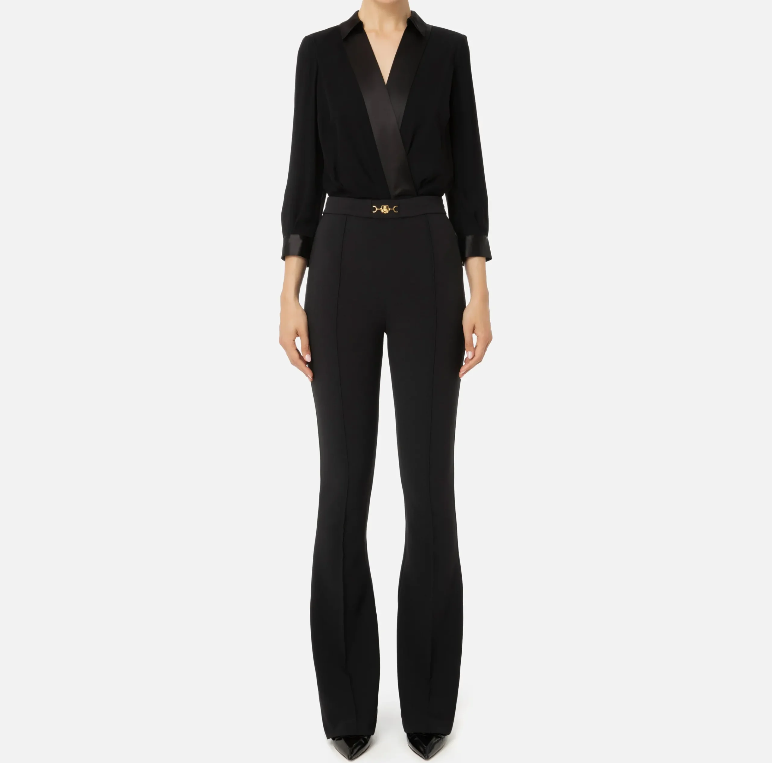 Tuta composta da camicia incrociata in doppia georgette con maniche a 3/4 e pantalone dritto leggermente svasato al fondo in crêpe stretch. È caratterizzata da morsetto logo in metallo dorato sul fascione.