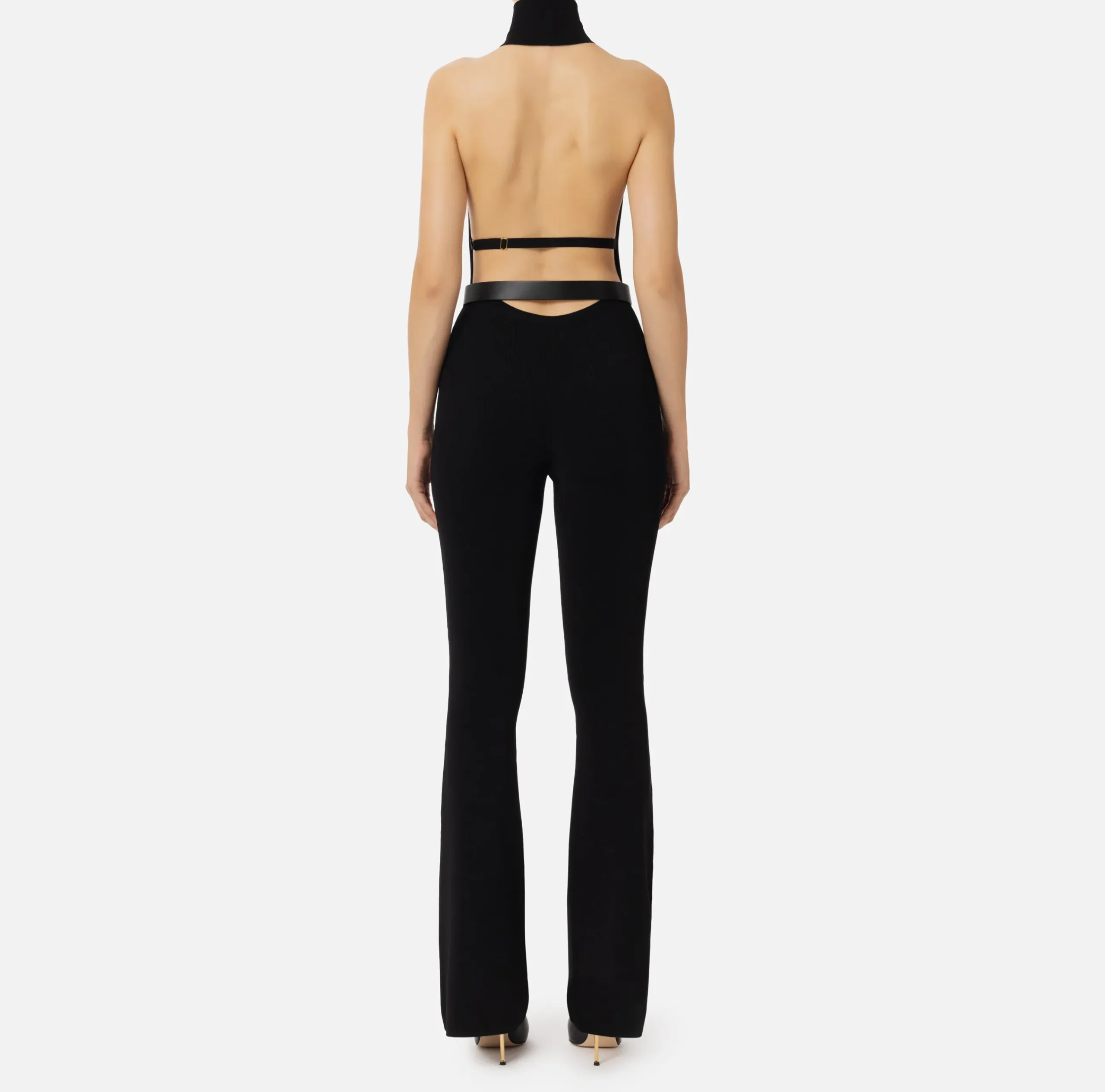 Tuta in viscosa lucida smanicata con collo alto e profonda scollatura su décolleté e schiena. Il punto vita è enfatizzato da una cintura in materiale sintetico effetto pelle con logo in metallo dorato che sovrasta il pantalone a zampa.