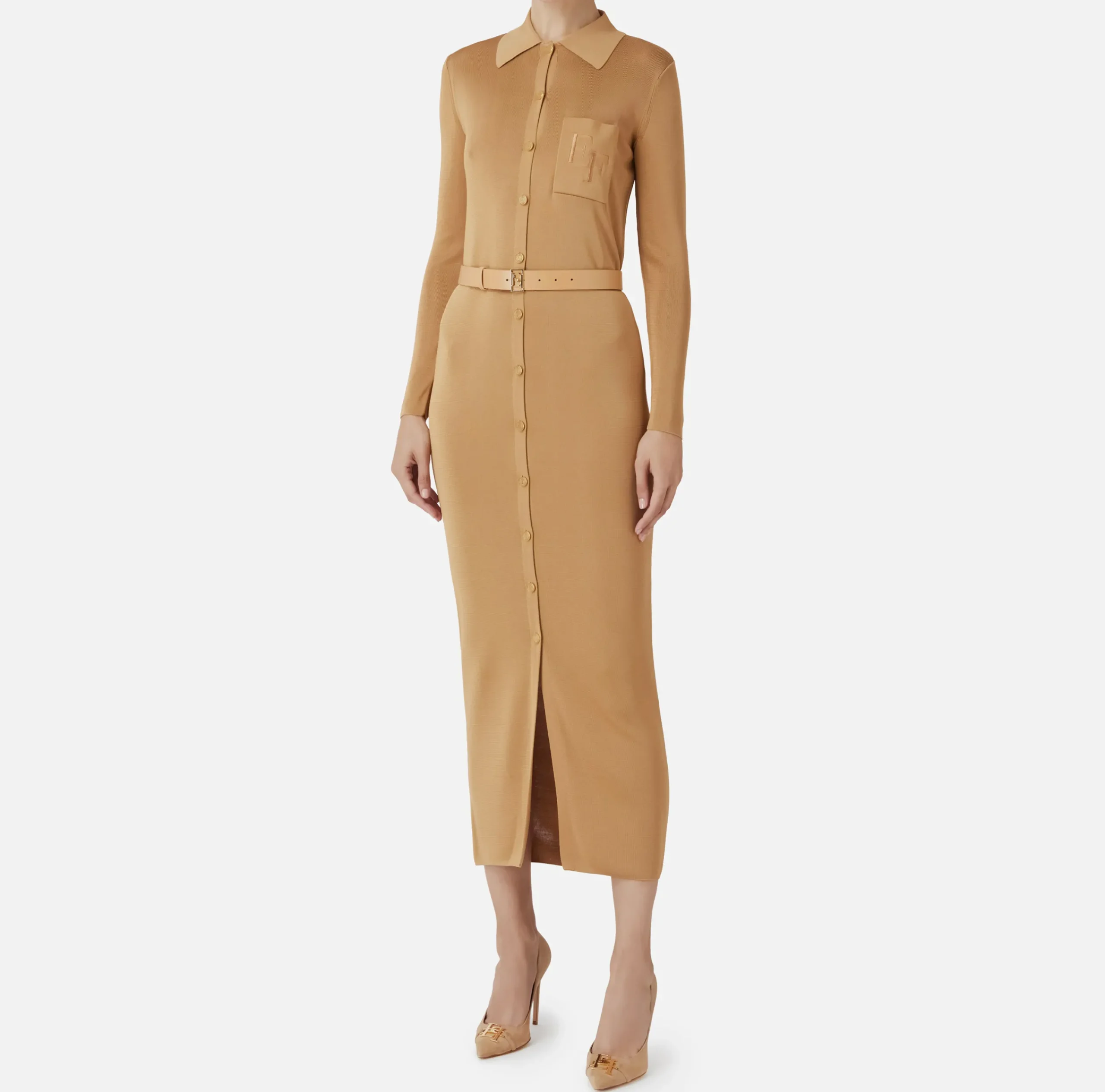 Abito lungo in viscosa lucida a maniche lunghe con colletto e abbottonatura tipo camicia. È caratterizzato da taschino con ricamo logo a filo in tono. Il punto vita è enfatizzato da una cintura in materiale sintetico con fibbia logo in metallo dorato.