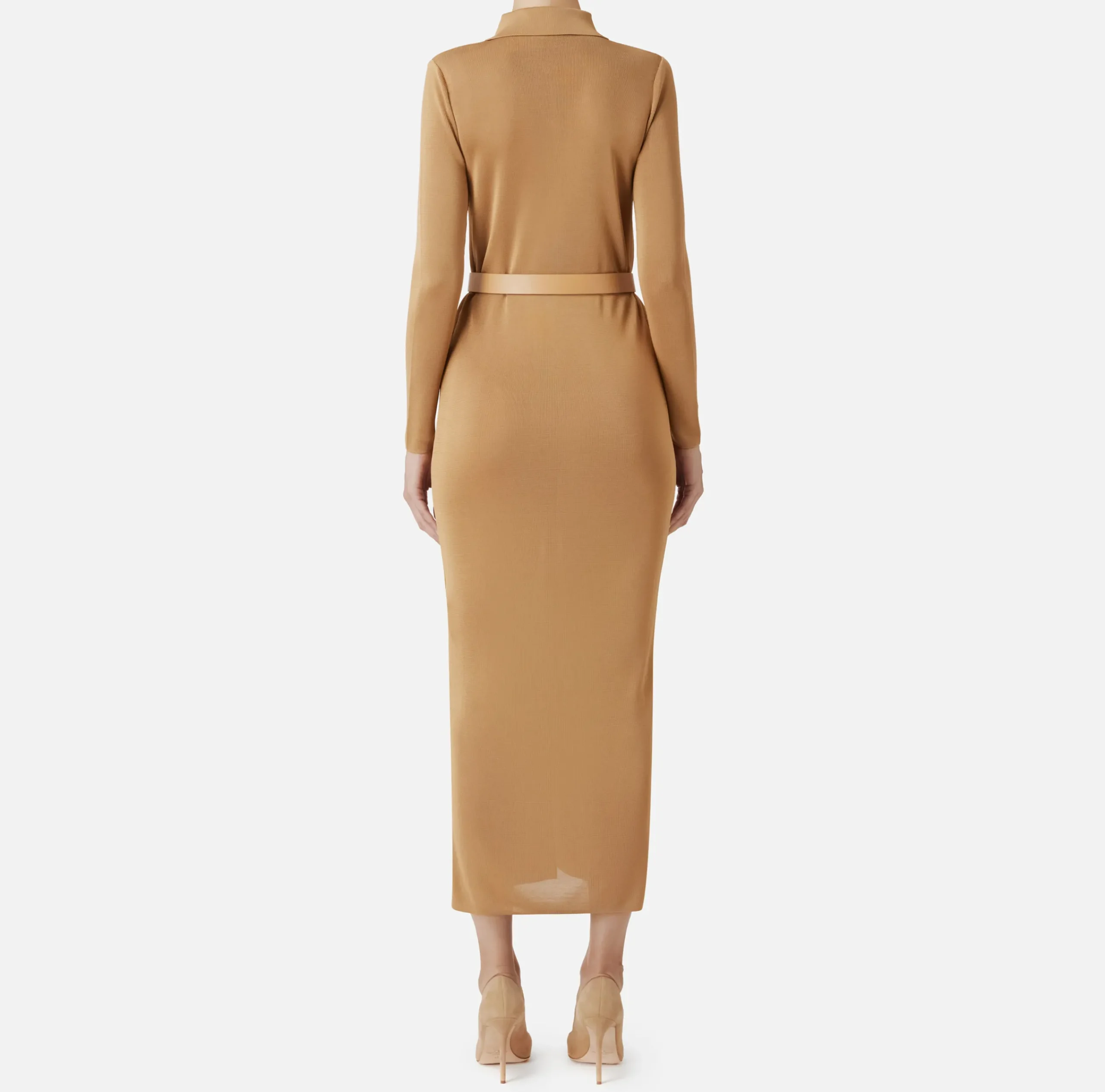 Abiti In Maglia|Abiti|Elisabetta Franchi Abito lungo in viscosa lucida con ricamo logo e cintura Bronze