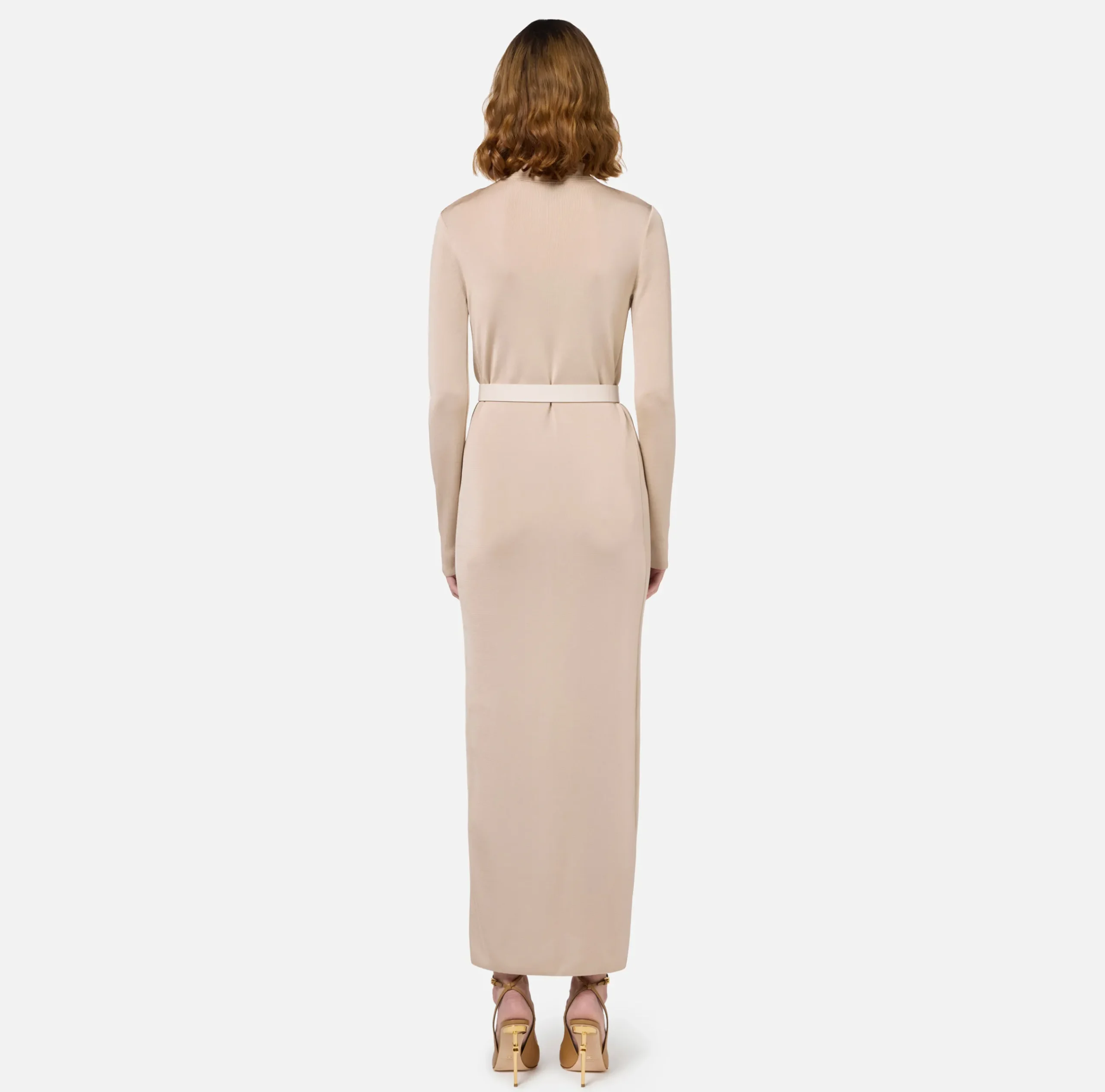Abiti In Maglia|Abiti|Elisabetta Franchi Abito lungo in viscosa lucida con ricamo logo e cintura Lattice