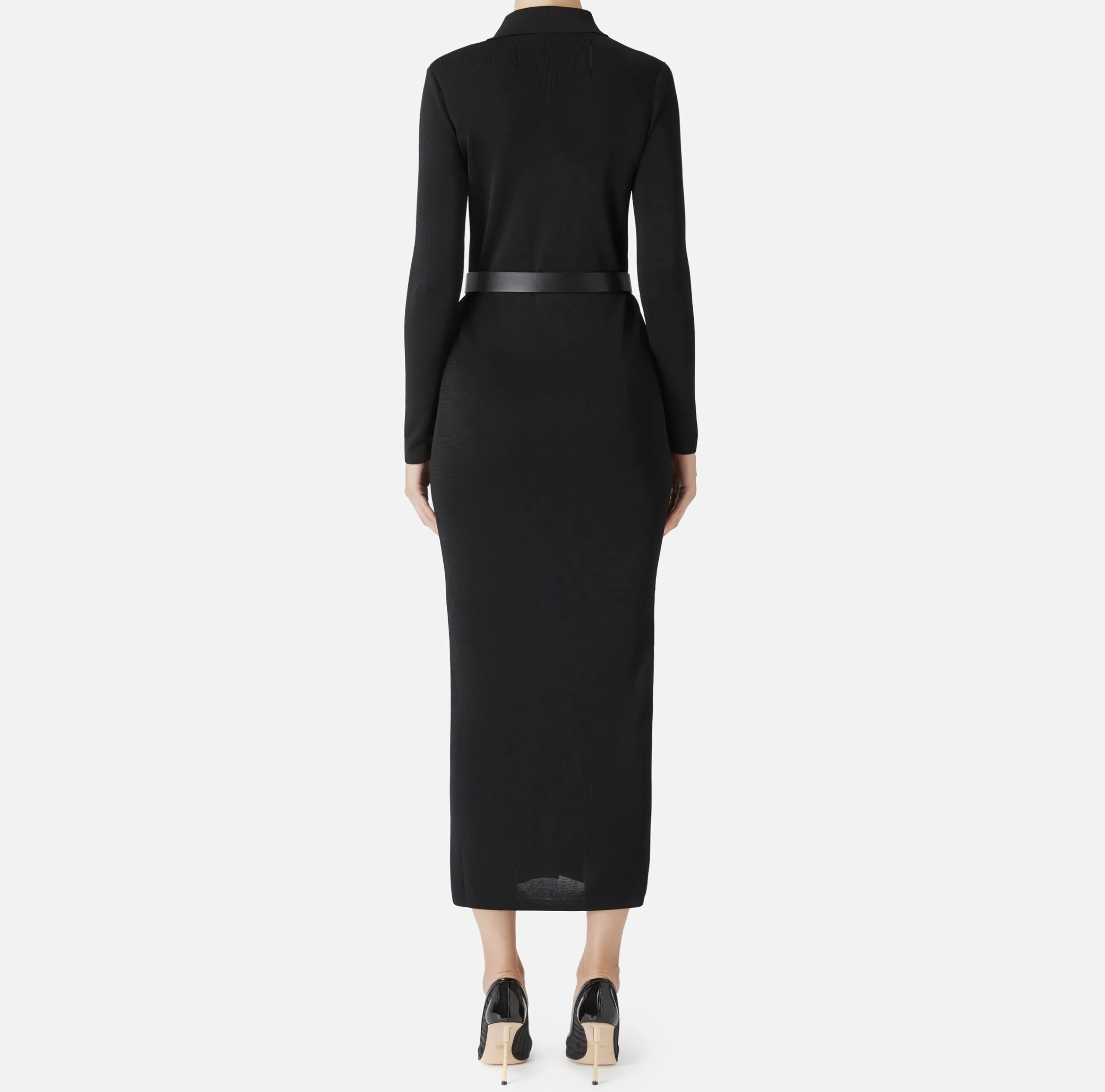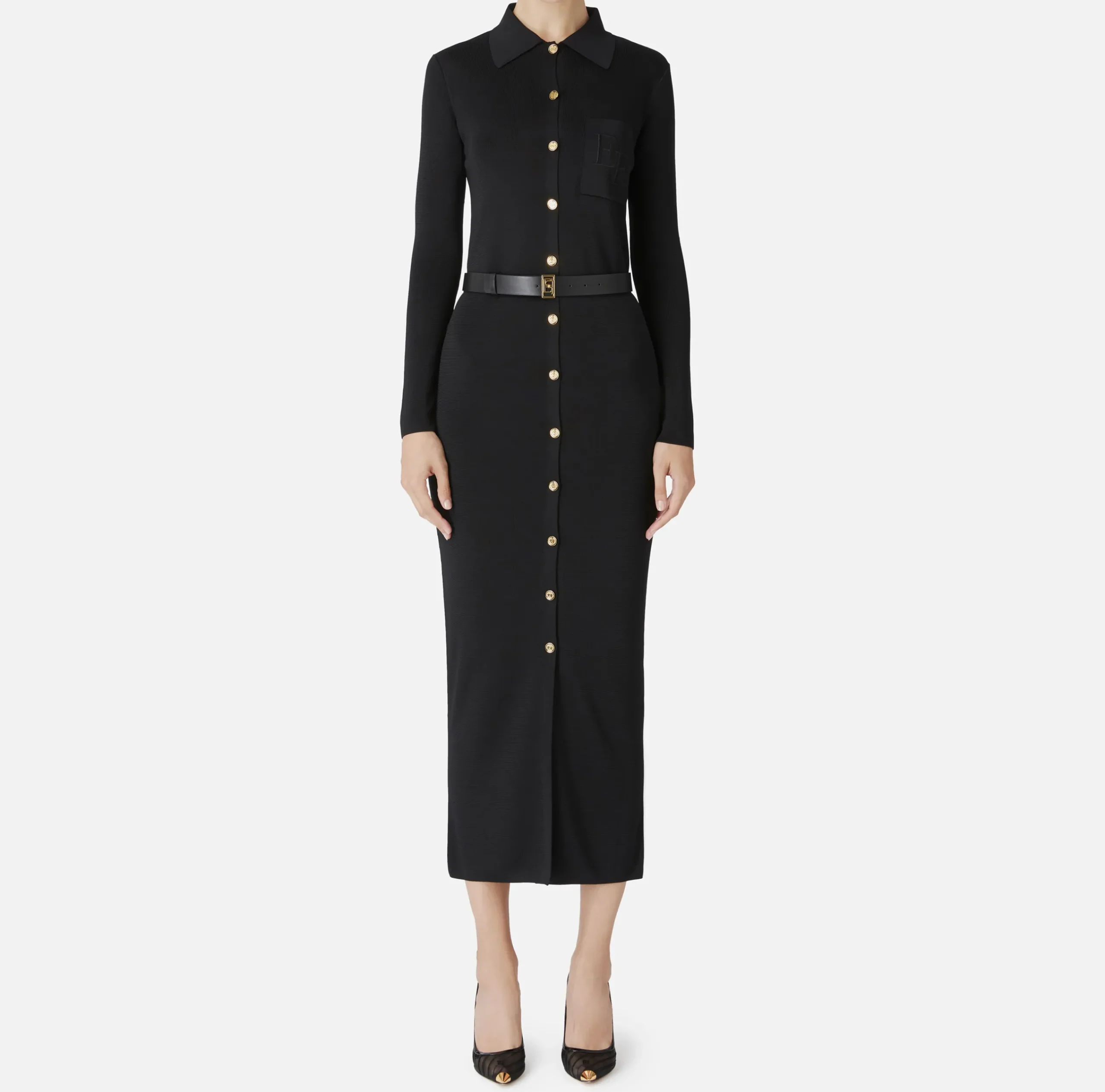 Abiti In Maglia|Abiti|Elisabetta Franchi Abito lungo in viscosa lucida con ricamo logo e cintura Nero